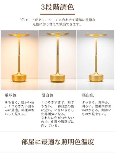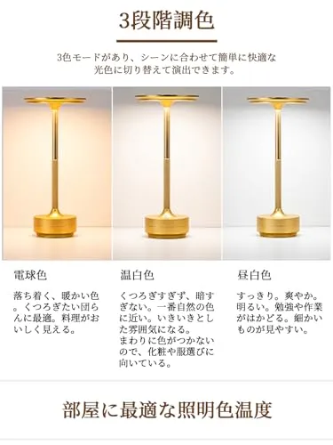 【タッチ制御&3段階調色&無段階調光】 ランプ上部のスイッチを一度タッチすることで、3色「昼白色・電球色・温白色」の温度が切り替わります。スイッチを長押しすると、各モードの明るさを5%から100%まで無段階で調整可能です。