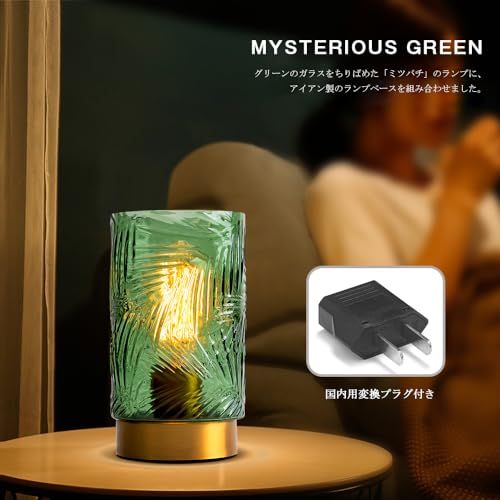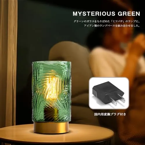樹木の葉をイメージした模様の(グリーン系)ガラスのランプ---一番の特徴はそのカットガラスに反射する煌びやかな光るの演出。お酒や食事の席に…就寝前のリラックスタイムに。角度によって表情を変える光は、ゆったりとしたプライベートな時間を共に過ごしてくれるあわいいパートナーに。