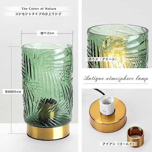 商品サイズ:高さ20.5cm/幅11.2cm/ベースφ10cm コード長:1400mm 重量:約0.76kg 素材:アイロン・ガラス カラー:グリーンとゴールド 消費電力:MAX.60W 電源方式:AC 100V 備考:中間スイッチ有(点灯-消灯) 付属品:取扱説明書 対応電球:口金E26/LED電球使用可 ※こちらの商品には電球は付属しておりません。