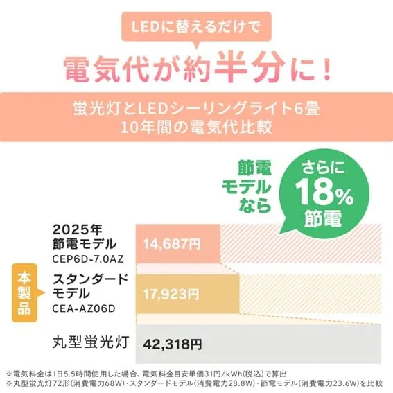 【節約】家の照明をLEDに変えるだけで効率的な節電に。蛍光灯とLEDシーリングライト10年間の電気代は、24,395円もお得になる。 ご覧いただきありがとうございます。