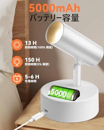 【充電式ライト】5000mAhのバッテリーを内蔵しており、5-6時間が充電完了できる。100%輝度点灯時間(13-14時間)、5%輝度点灯時間(140-150時間) バッテリーで動作するルームライトなので、家の電源の状態に依存しませんから、突然の停電時でも利用できますし。