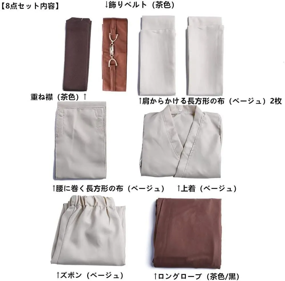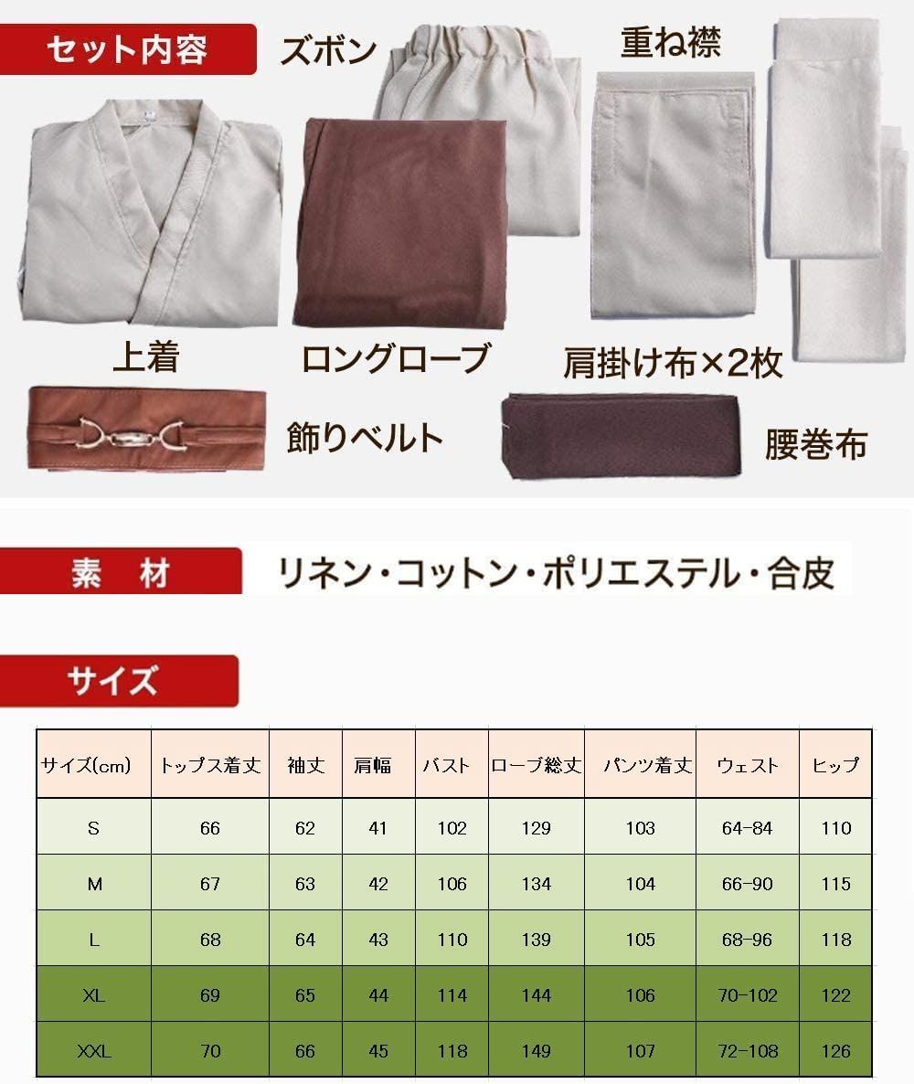 【8点セット内容】重ね襟(茶色)+上着(ベージュ)+肩からかける長方形の布(ベージュ)×2枚+腰に巻く長方形の布(ベージュ)+ズボン(ベージュ)+ 飾りベルト(茶色)+ ローブ(茶色/黒)の計8点のセット 「S&C Liveが販売、S&C Live発送します」のみからご購入ください。他の出品者が発送する場合、品質は保証しかねることをご了承くださいますようお願い申しげます。 Sサイズ:総丈129㎝、バスト87㎝、ウェスト67㎝、ヒップ92㎝、対象身長160-165㎝ サイズ:総丈134㎝、バスト95㎝、ウェスト74㎝、ヒップ98㎝、対象身長165-170㎝ Lサイズ:総丈139㎝、バスト103㎝、ウェスト81㎝、ヒップ104㎝、対象身長170-175㎝ XLサイズ:総丈144㎝、バスト111㎝、ウェスト88㎝、ヒップ110㎝、対象身長175-180㎝ XXLサイズ:総丈149㎝、バスト119㎝、ウェスト95㎝、ヒップ116㎝、対象身長㎝