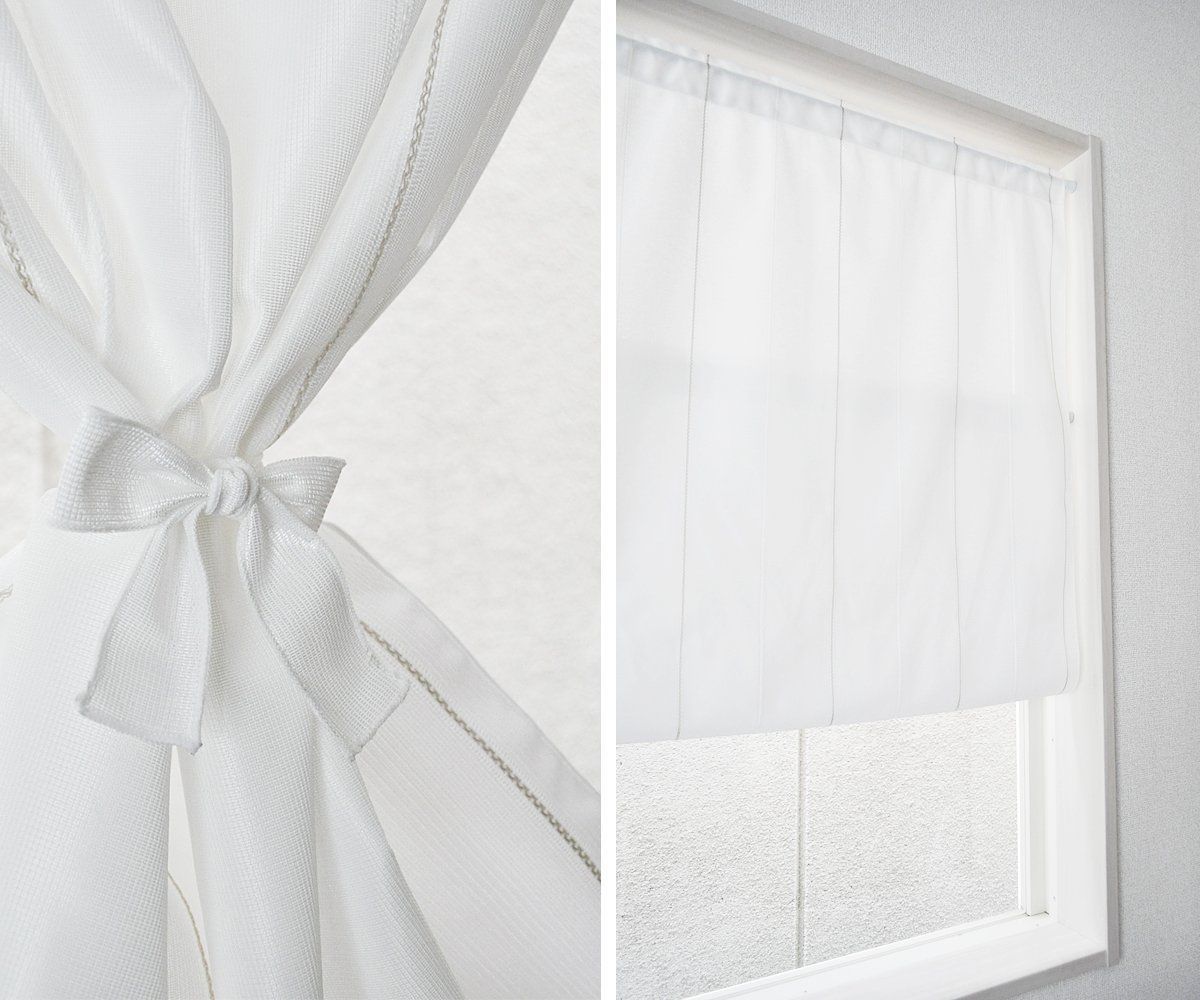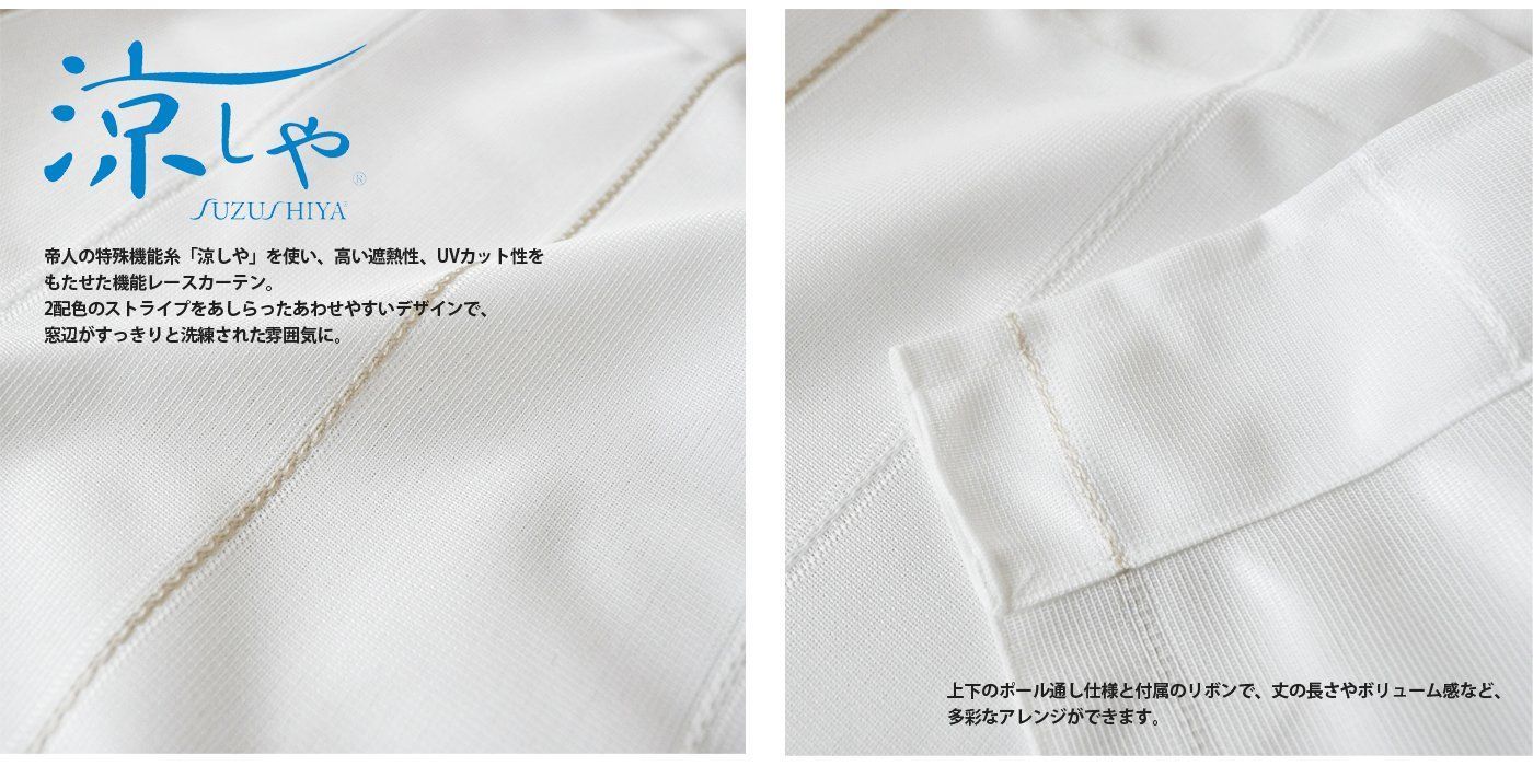 【生産】 日本 帝人の特殊機能糸「涼しや」を使用した遮熱UVカット効果のある小窓用ミラーレースカーテン。 上と下と両方にポールが通せるようになっており、下のポールを上下することで丈の調整ができます。 丈の調節具合でバルーンっぽくなるので、また違った風合いが楽しめます♪ また、共布のタッセルがついており、お好きな位置でカーテンを縛ってまた違った雰囲気が楽しめたりと、いろんなアレンジができるのがうれしいです★ 小さめな窓を飾る機能的なカーテンがほしいという声から生まれた小窓用カーテン。シンプルであわせやすいストライプ柄で、どんなインテリアにもあわせやすいのも魅力です。 安全警告 このカーテンは、子供やペットが絡まるおそれがありますので、適切に固定してください。また、ポリエステル製のため、火気や高温に注意してください。
