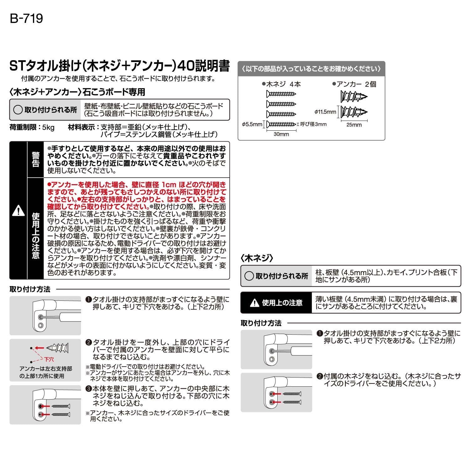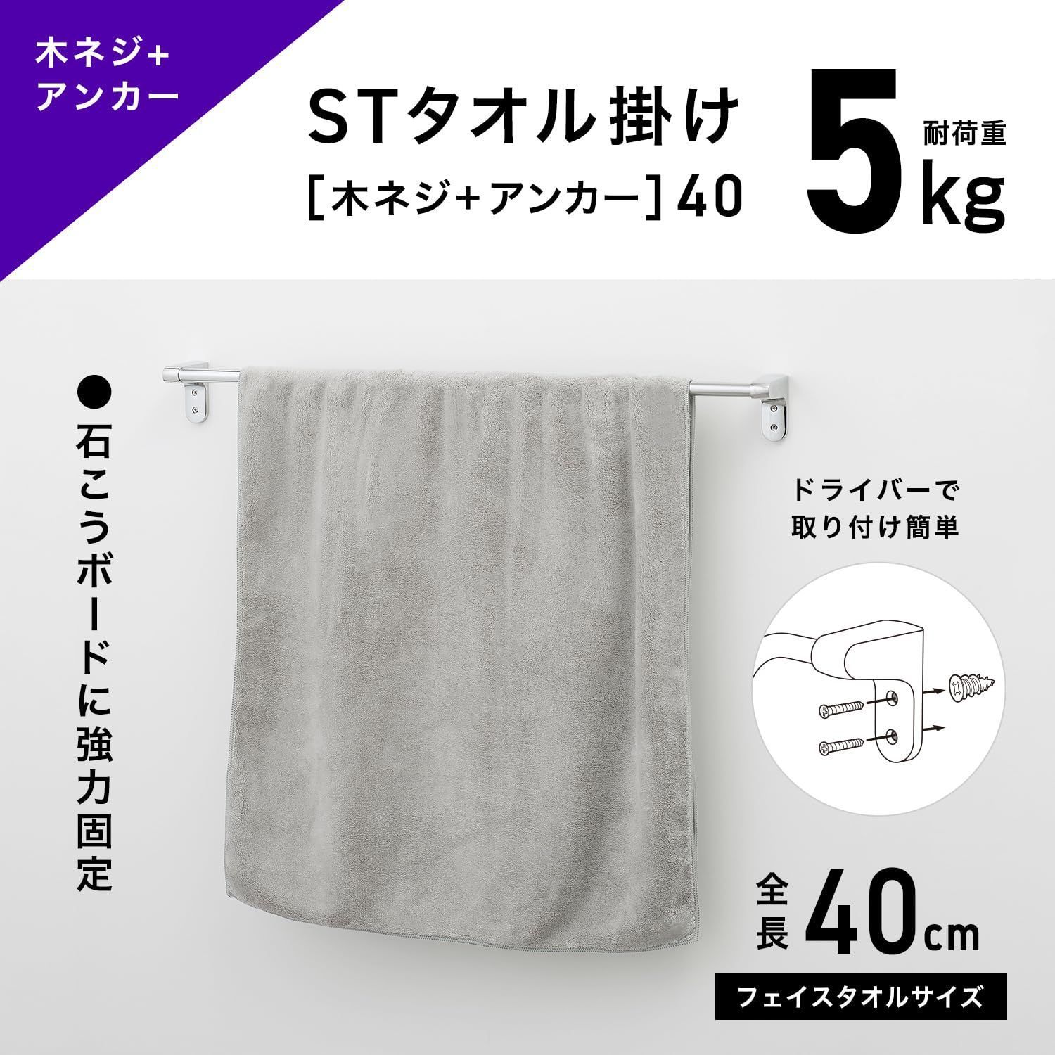 【迅速発送】レック ストロング タオル掛け (タオルバー) 木ネジ+アンカー 40㎝