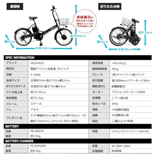 PROVROS(プロブロス) 電動アシスト自転車 20インチ 折りたたみ シマノ6段変速 リチウムイオンバッテリー7.8Ah 前輪駆動 最大46km走行 型式認定 公道可能【1年】P-206E★m