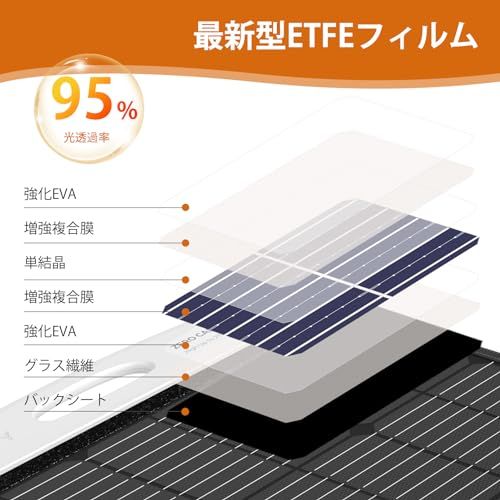 【最新型ETFE・高光透過率】ERICSITY 折り畳みソーラーパネルは最新の光透過率が高くのETFEフイルムを採用しております、PETフイルムに比べて、塗膜が厚く、耐熱や耐久性や耐候性などに優れます。高温の環境にも低温の環境にも耐え、光透過率が95%達して、より効率的に日光を吸収して発電し、日陰や日暮れなど弱い日光条件でも発電できます。