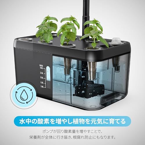 【自動で空気と水を循環】ライトパネルに搭載されたファンと、バスケット内のポンプが自動でオンオフを繰り返します。空気が循環することで受粉確率が高まり、水中の酸素量を増やすことができます。低ノイズなので、寝室に設置しても安心です。