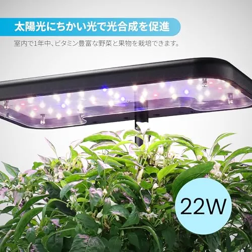 【太陽の光に近いLEDライト】22ワットの「太陽光」に近いライトを搭載。どんな天候の日でも室内で植物の光合成を促せる、家庭菜園にぴったりの水耕栽培キットです。