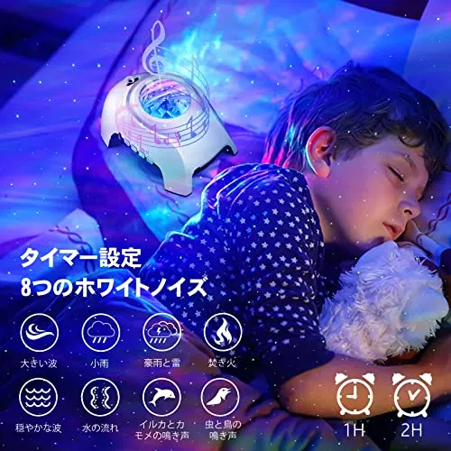 【リモコン付き・タイマー機能】プラネタリウム本体の4つボタン除いて、便利リモコンを付き、リモコンによってライトのオン/オフ、照明モードの変更、照明効果の切り替え、明るさの調整、モーションの開始/停止、タイマー機能、音量の調整を簡単に操作できます。1時間または2時間後に自動的にオフになるように設定できます。設定されていない場合、4時間後に自動的にオフになります。就寝後一晩中電気をつける心配がなく、電気代を節約できます(リモコンは単4電池をご使用ください。(電池別売))のホワイトノイズは、子供をよりよく眠らせることができます。