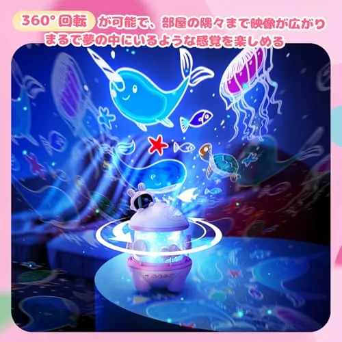 【USB充電式&360度回転】USB充電式で持ち運びに便利です。充電時間は約4時間の連続使用が可能です。本体が360度回転可能で、美しい光景を天井や壁に投影します。