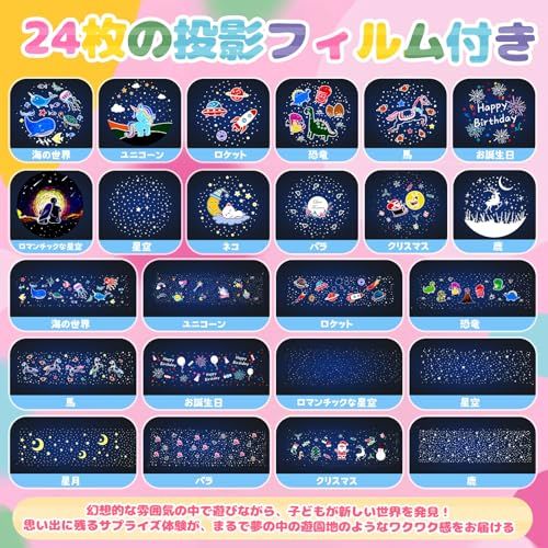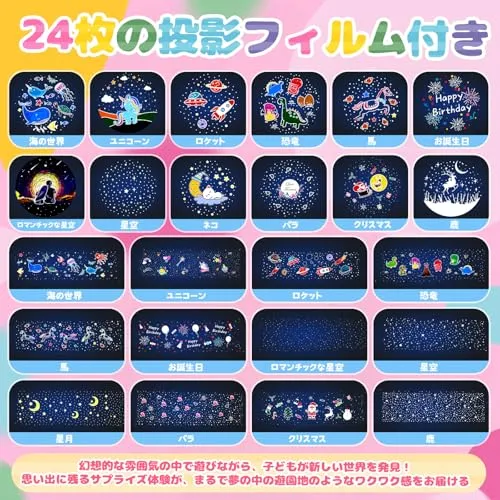 【24枚のプロジェクションフィルム搭載】恐竜、ネコ、星空、クリスマス、お誕生日など、様々なテーマを楽しめる24枚のプロジェクションフィルムをご用意します。お部屋を夢の世界に変え、子どもも大人もワクワクする体験が可能です。