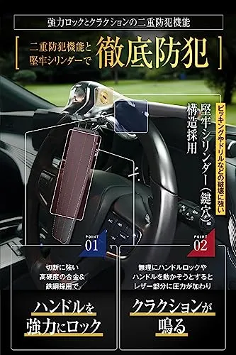 【 強力なハンドルロックとクラクション機能の “二重防犯機能” 搭載 】 二重防犯機能ポイント1「強力なハンドルロック」 : ヘッド部分に高品質の高硬度合金&鉄鋼を採用することで、簡単に切断されない “業界内トップクラス” の強力なハンドルロック性能を実現。パイプカッターなどの切断にも負けず、圧倒的な盗難防止能力を発揮します。 二重防犯機能ポイント2「クラクション機能」 : ハンドルロックが設置された状態で強引にハンドルを動かそうとすると、ハンドルロック本体のレザー部分に圧力が加わり、クラクションが鳴る仕組みになっております。「1.強力なハンドルロック」と「2.クラクション機能」の二重の防犯機能を搭載。
