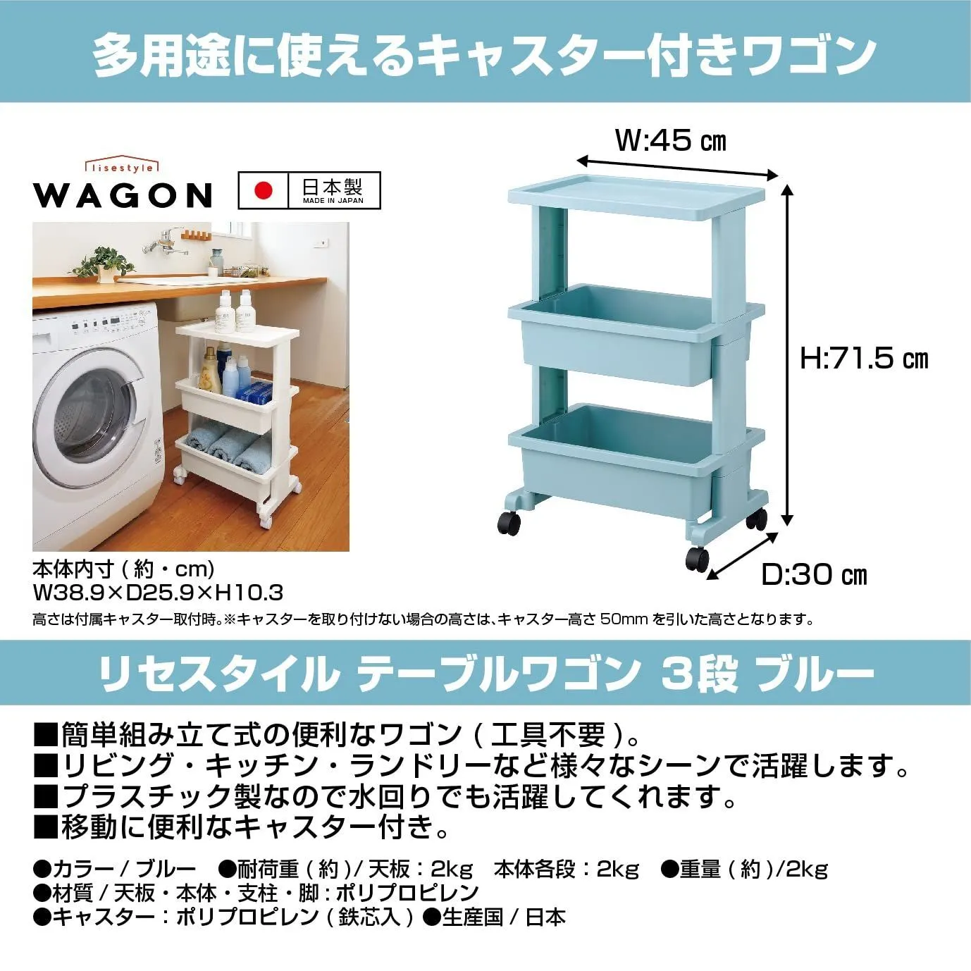 JEJアステージ(JEJ Astage) 収納 リセ テーブルワゴン 3段 ブルー 日本製 簡単組立 (約)幅45×奥行30×高さ71.5cm