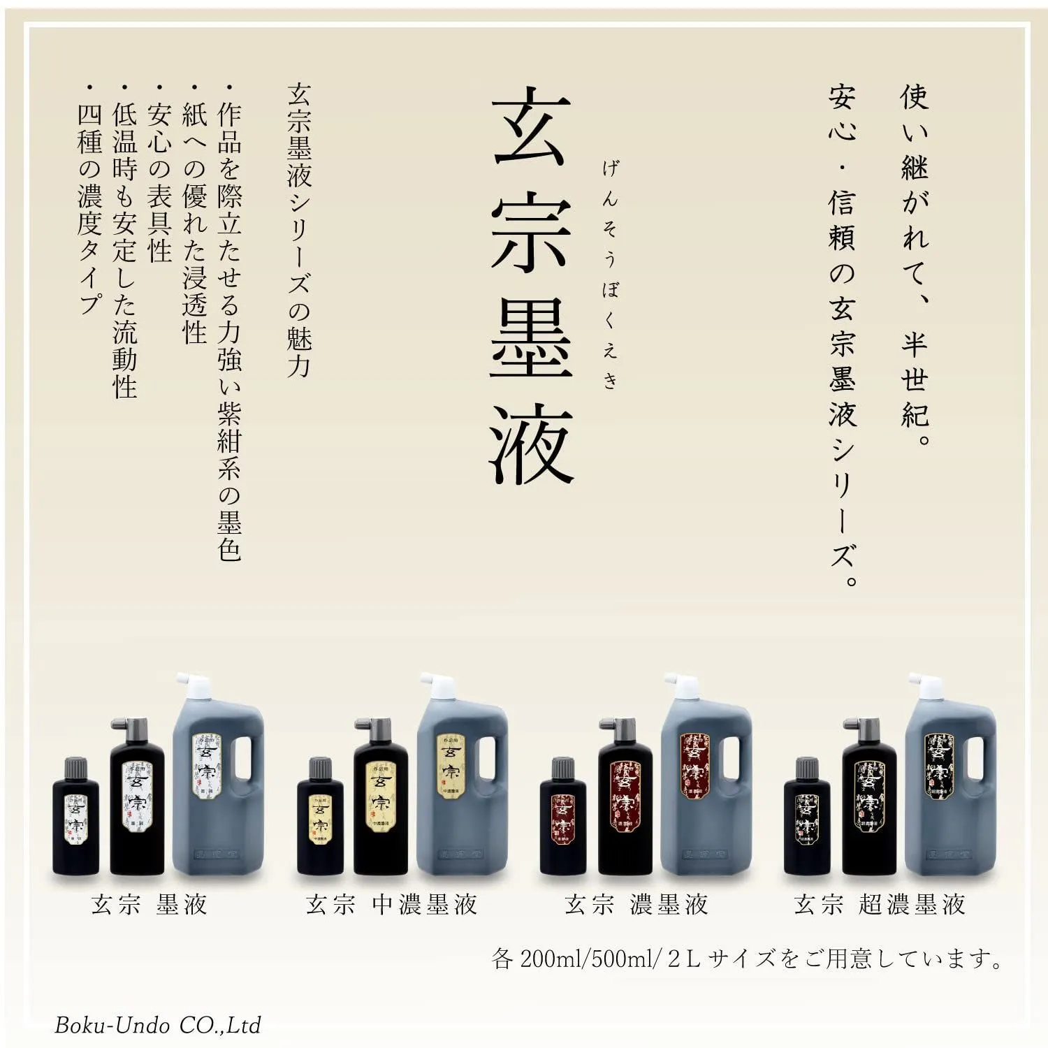 【玄宗】 固形墨の持つ書き味、暢び、紙への浸透性・表具性をすべて備えた液体墨として開発されたシリーズ