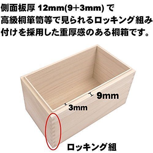 ●仕様は、側板を凹凸に切込みを入れたものを組み合せたロッキング組(アリ組)で高級感があり、箱の本体側面が二重になる印籠式ですので、、丈夫で密閉性が高く外気の影響を受けにくくなっています。 ~ご注意~ ○落下や打撲等で凹んだ際は、凹んだ部分に水をつけて自然乾燥させてください。小さな凹みの場合はほとんど元に戻ります。 ○板状の天然木は、湿度の変化に敏感です。特に桐材は材質が柔らかいため特に敏感です。 乾燥した空気に触れていますと、板が反ってしまう場合があります。冬場にエアコン等で乾燥した部屋に置いておくと特に反ってしまいやすくなります。 桐箱は、蓋板及び底板に側板を貼り付けてありますが、素材が柔らかいため蓋(底)が反ってしまう場合があります。 桐箱を製作する際には十分乾燥した桐材を使用し、当店から出荷する際は反りのない状
