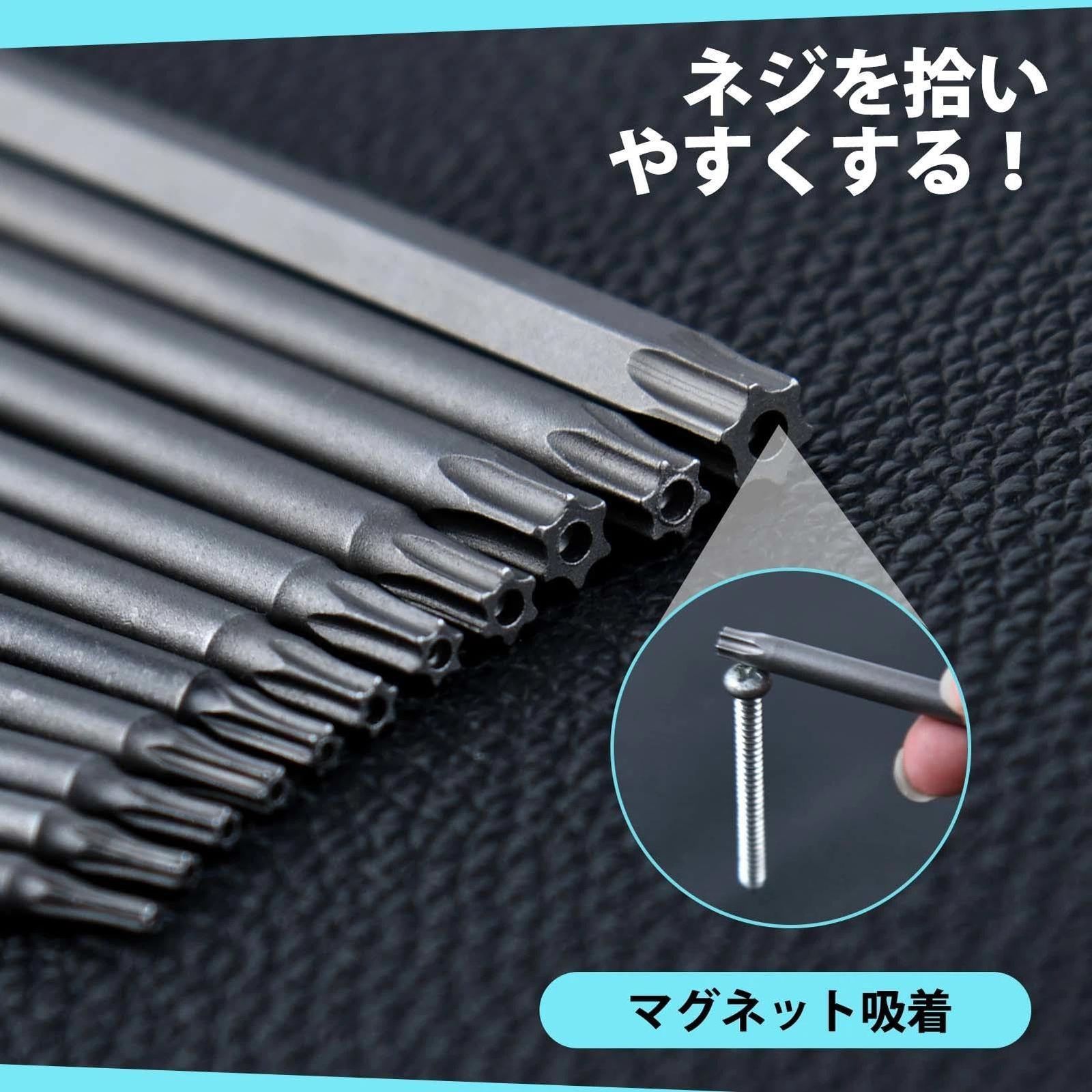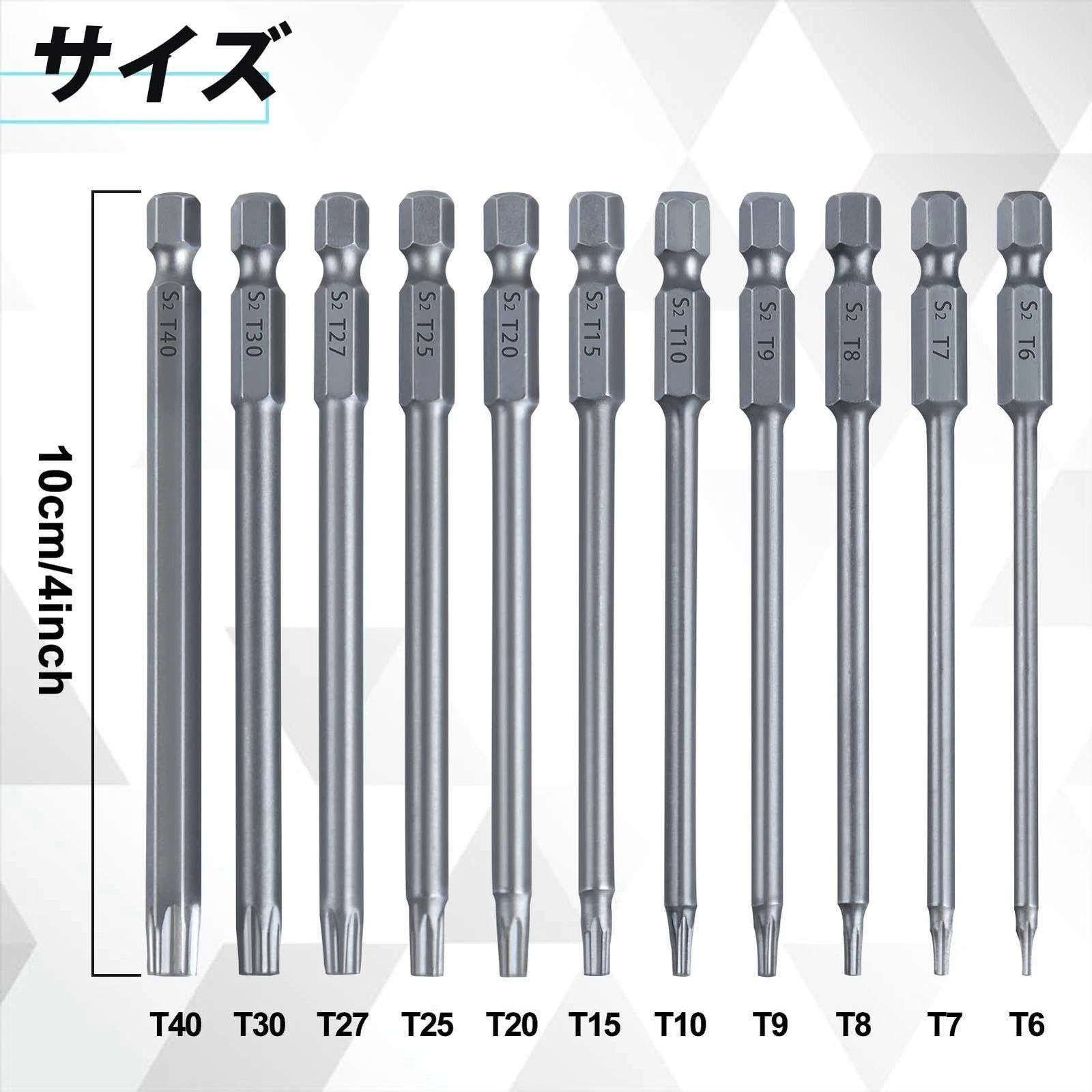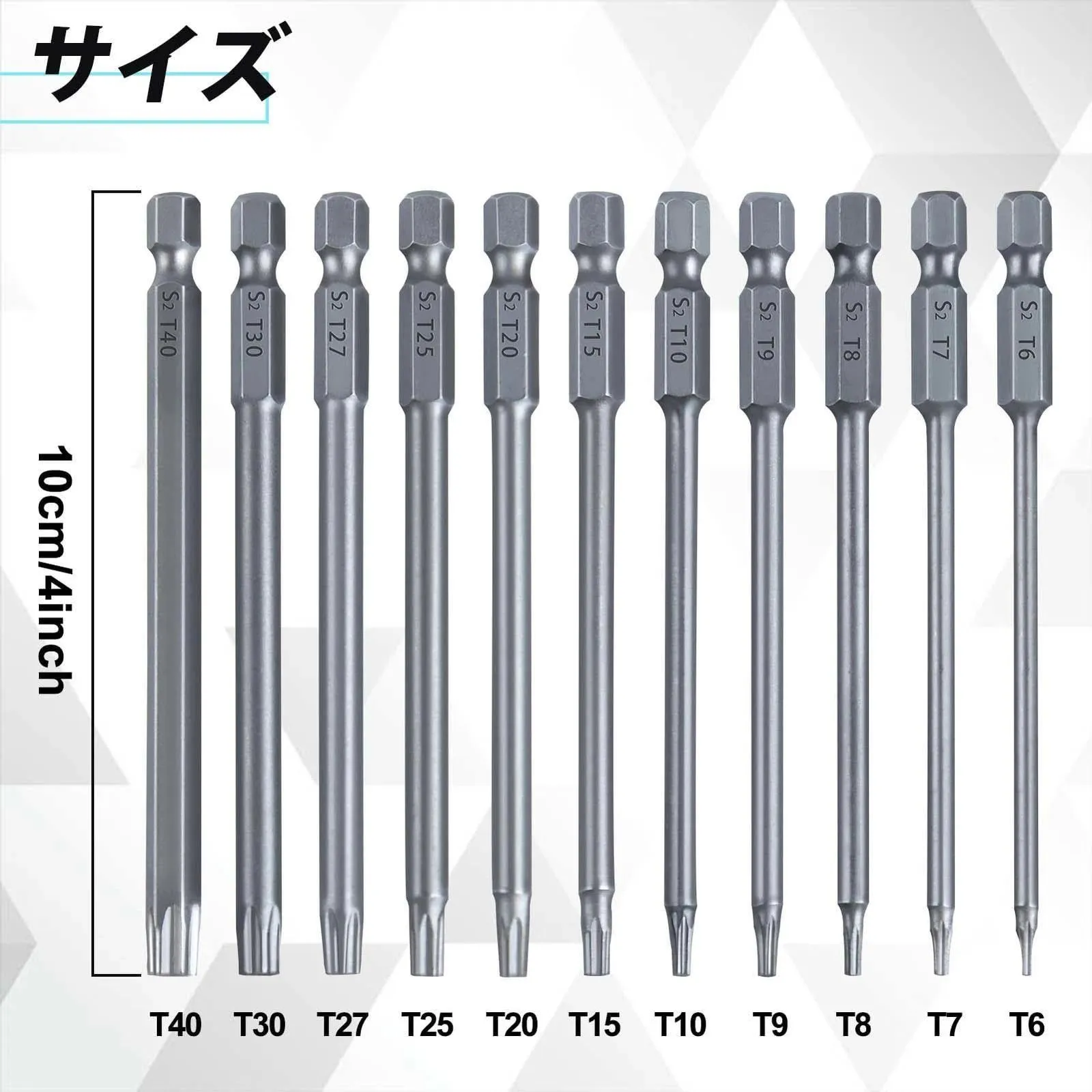 パッケージに含まれるもの:T6、T7、T8、T9、T10、T15、T20、T25、T27、T30、T40。あなたのさまざまなニーズを満たすために合計11種類のトルクスドライバービット。収納や持ち運びに便利な収納ボックス