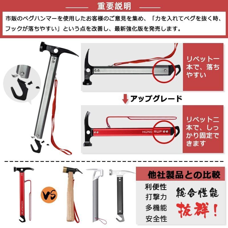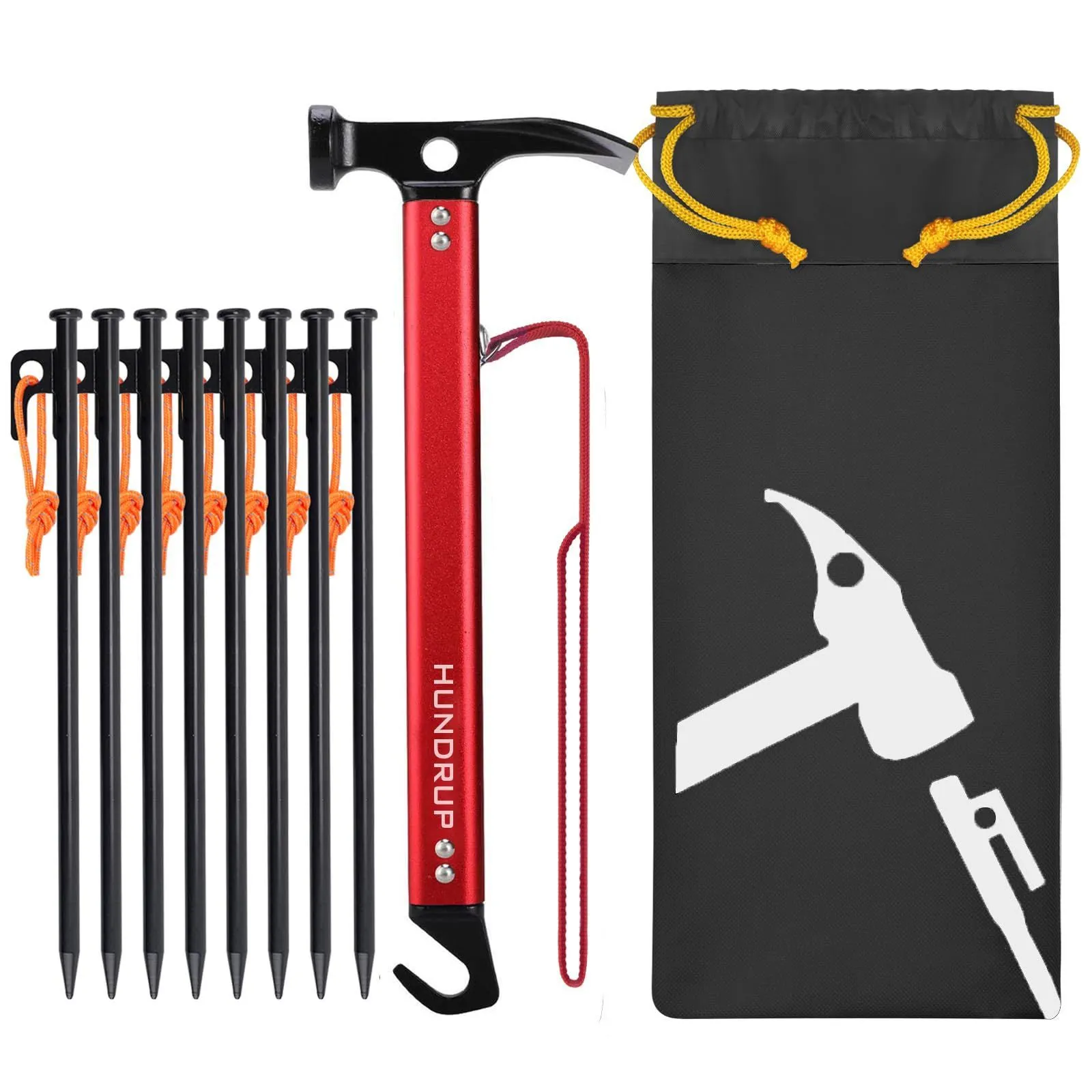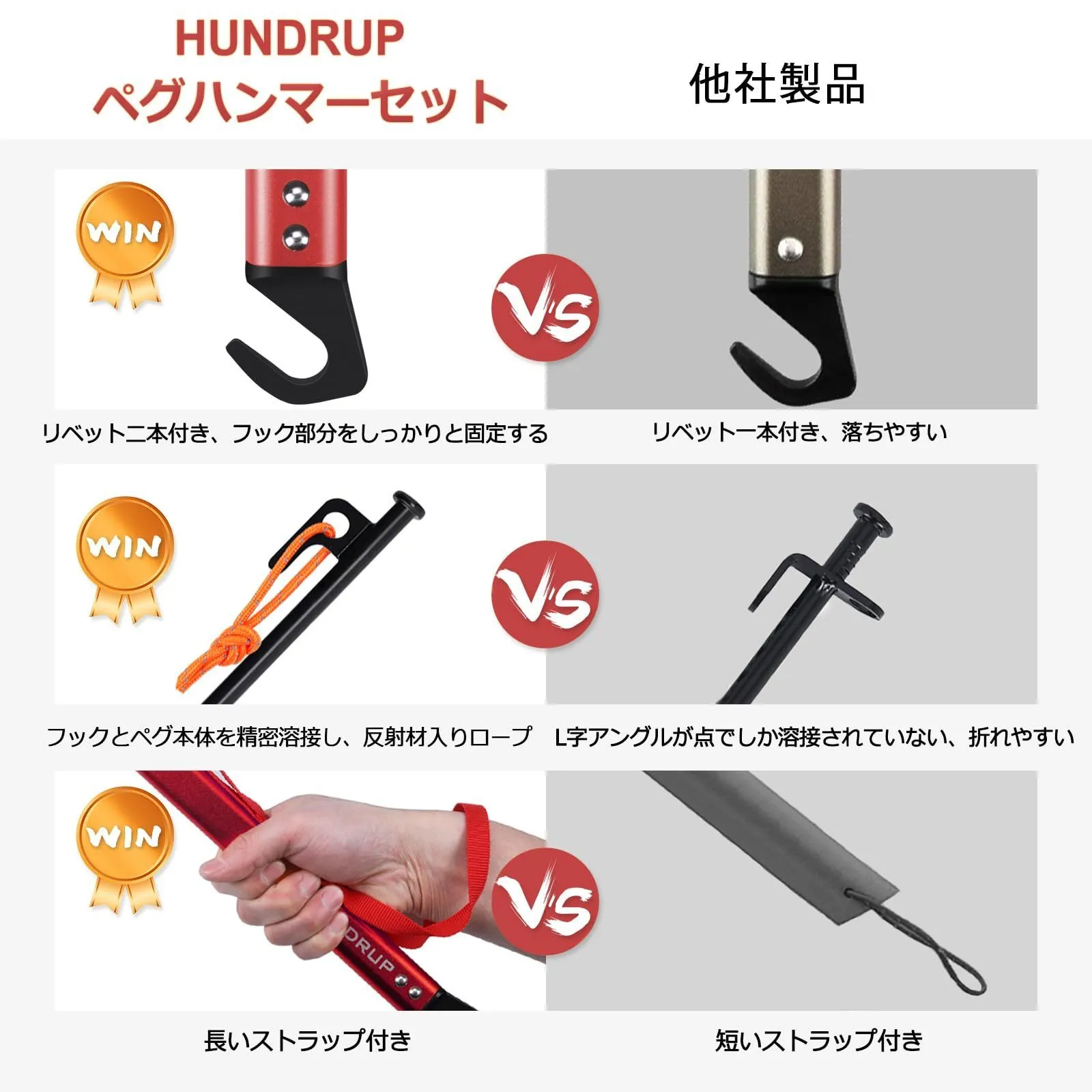 【迅速発送】HUNDRUP【強化版】 (ペグハンマー/30cmペグ 8本+ハンマーセット) キャンプハンマー 鍛造ペグ 反射材入りロープ付き 高炭素鋼 ハンマー 固定用リベット追加 収納袋付き(ランダム色) 3in1多機能 テントハンマー アルミ製 軽量 ペグ