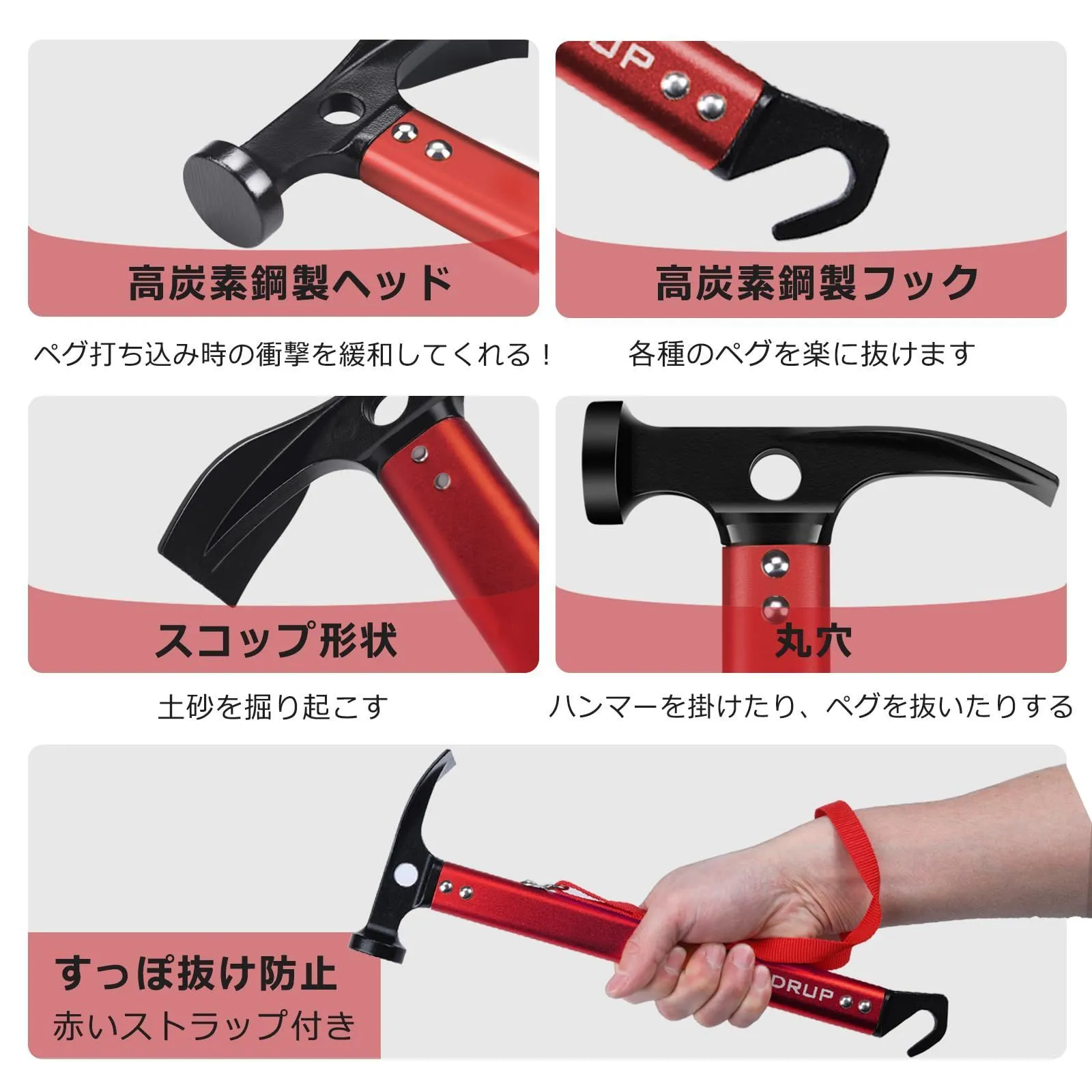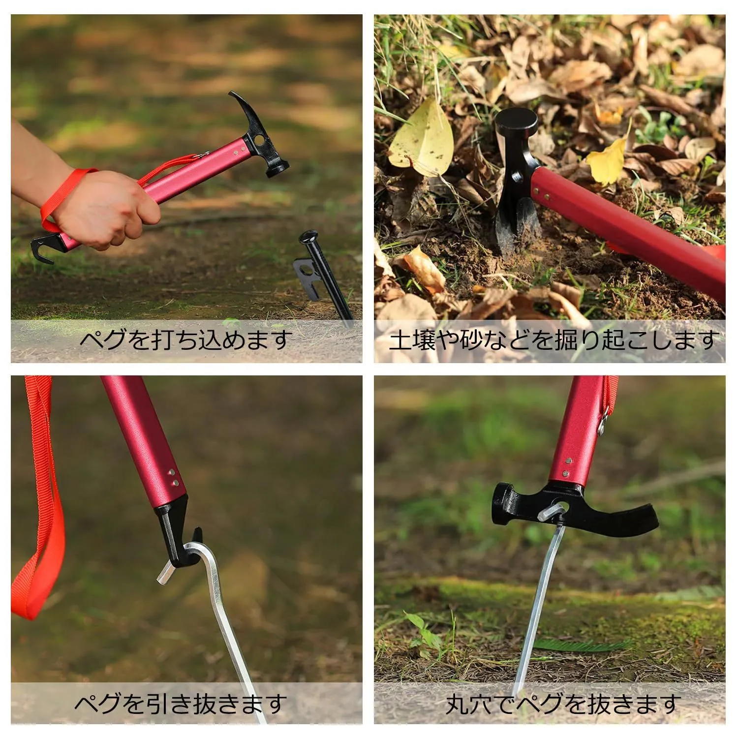 【3in1多機能ハンマー】:ペグ打ち、各種ペグの抜き、土掘りがこれ1本でこなします!①ヘッド部分が簡単にペグをしっかり打ち込めます;②ヘッド片側はスコップとして使え、土壌や砂などを掘り起こすことができます;③丸穴部分がハンマーを掛けるだけでなく、ペグを真上に引き抜くのもできます;④下のフック部分はソリッドステークも引っ掛けて簡単に抜くこともできます。キャンプ、防災、山登り、ハイキング、日常作業などのシーンでも大活躍です。