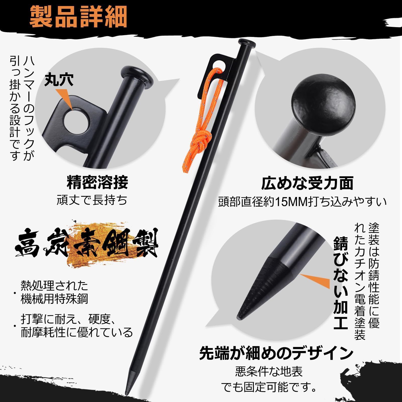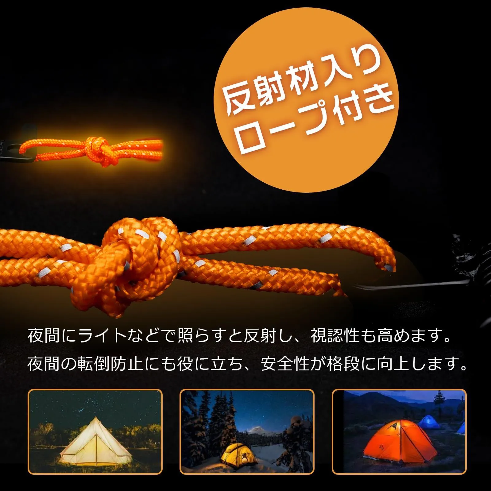 【夜光ロープ付きの鍛造ペグ】:他社の折れやすいアルミペグと違って、当社のペグハンマーセットはS45C鋼製の鍛造ペグが8本付き、頑丈で折れにくい。砂利や石が混じった固い地面でも入り込みが良く、ガッチリと固定します。ペグ表面は黒電着塗装処理を施すことにより、防錆性能が抜群です。それに、夜光ロープをテントペグのヘッド部に付けて、夜間の目印として安全に使用できます。