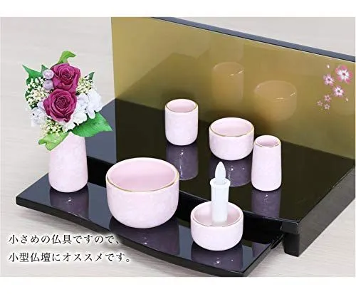 【6点】「コスモス」ピンク さくら柄 色: ピンク さくら柄の仏具6点セットです。 金の縁取りが入り高級感もあります。 陶器製でお手入れもしやすいです 。 小さめの仏具ですので、小型仏壇にオススメです。