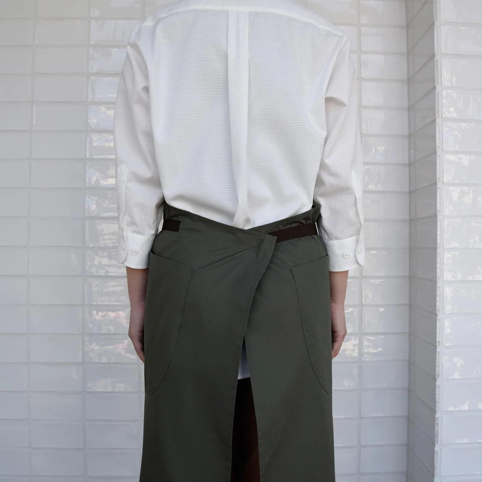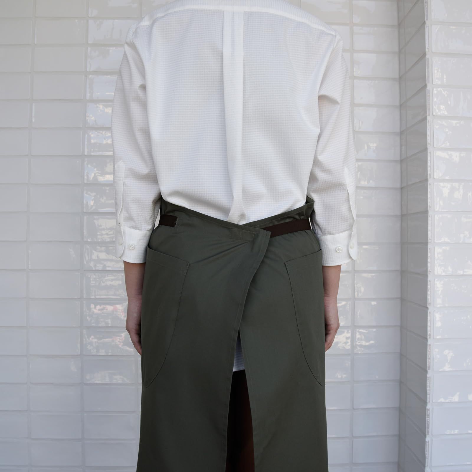 ツイルでありながら表面が滑らかなブロークンツイルというオリジナル生地を開発、制電糸入り、ストレッチ有り、SRという汚れが落ちやすい機能があります。生地に触れると綿100%に感じますが耐久性を考えてポリエステルを混ぜています。多色展開、紐配色により色々な表情があり、どんな服にもあう色調が特徴、カジュアルからエレガントまで色々なシーンにあいます。胸にペン用ポケットあり、種類によりますが2本程度は入ります。腰には左右で大きなポケット有り、ゴミがたまりにくいラウンドデザインになっています。前に深いベントがあり足さばきが楽です。後ろの腰紐通しのホールを利用するときれいに着用できます。
