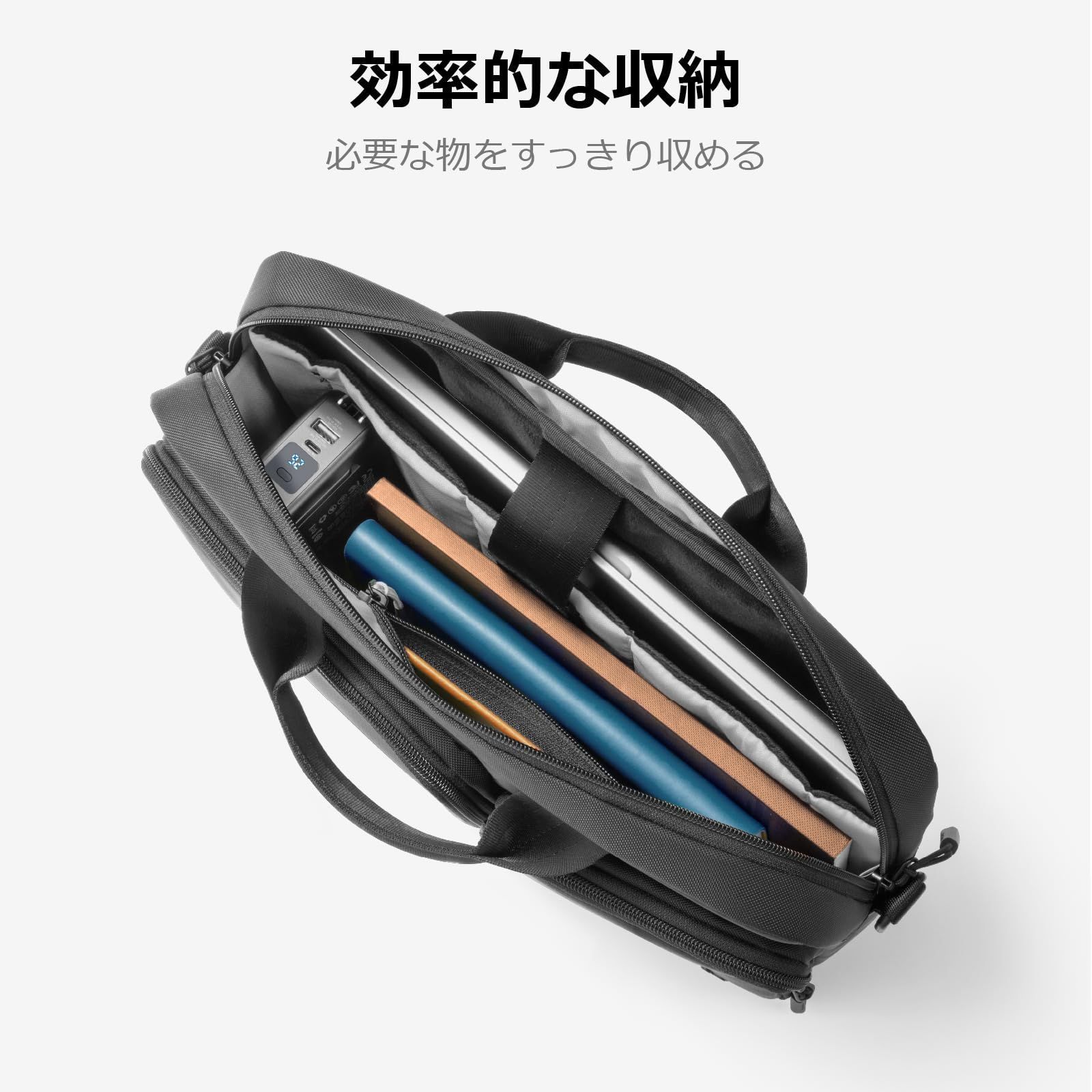 【パワフルな収納システム】コンパクトでながら4室。大小2つのフロントポケット、メイン収納部に複数なポケットとAirTagや鍵掛用ストラップを配し、アダプタ・ケーブル・マウス・ハブ・ペン・名刺などをスッキリ収納・整理できます。背面にもポケットがあり、書類やファイルなどよく出し入れのモノを収納できます。