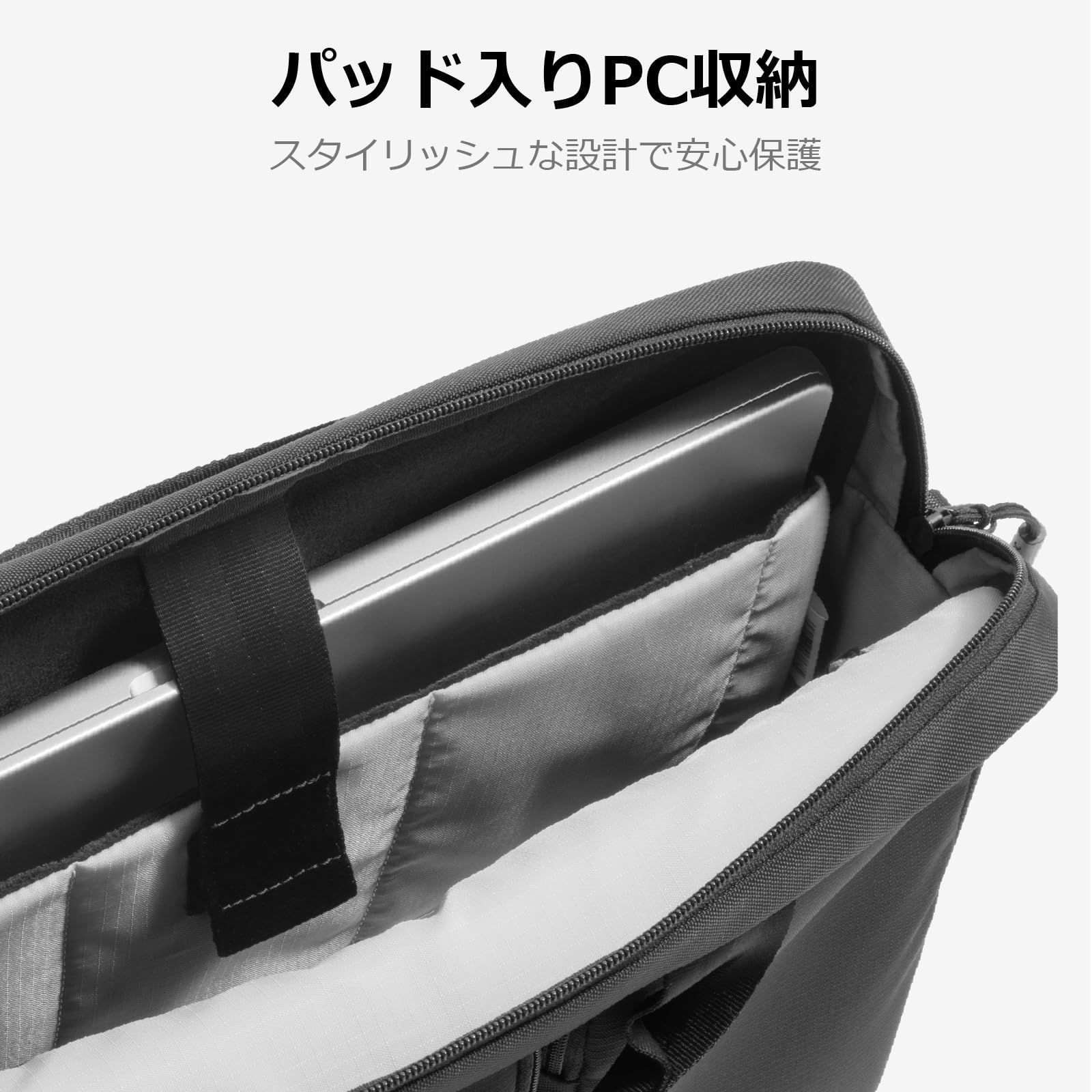 【ノートPCをしっかり保護】 PC収納スペースには厚みのあるスエードライナーを使用し、移動時の衝撃や擦り傷から大切なデバイスをしっかり守ります。