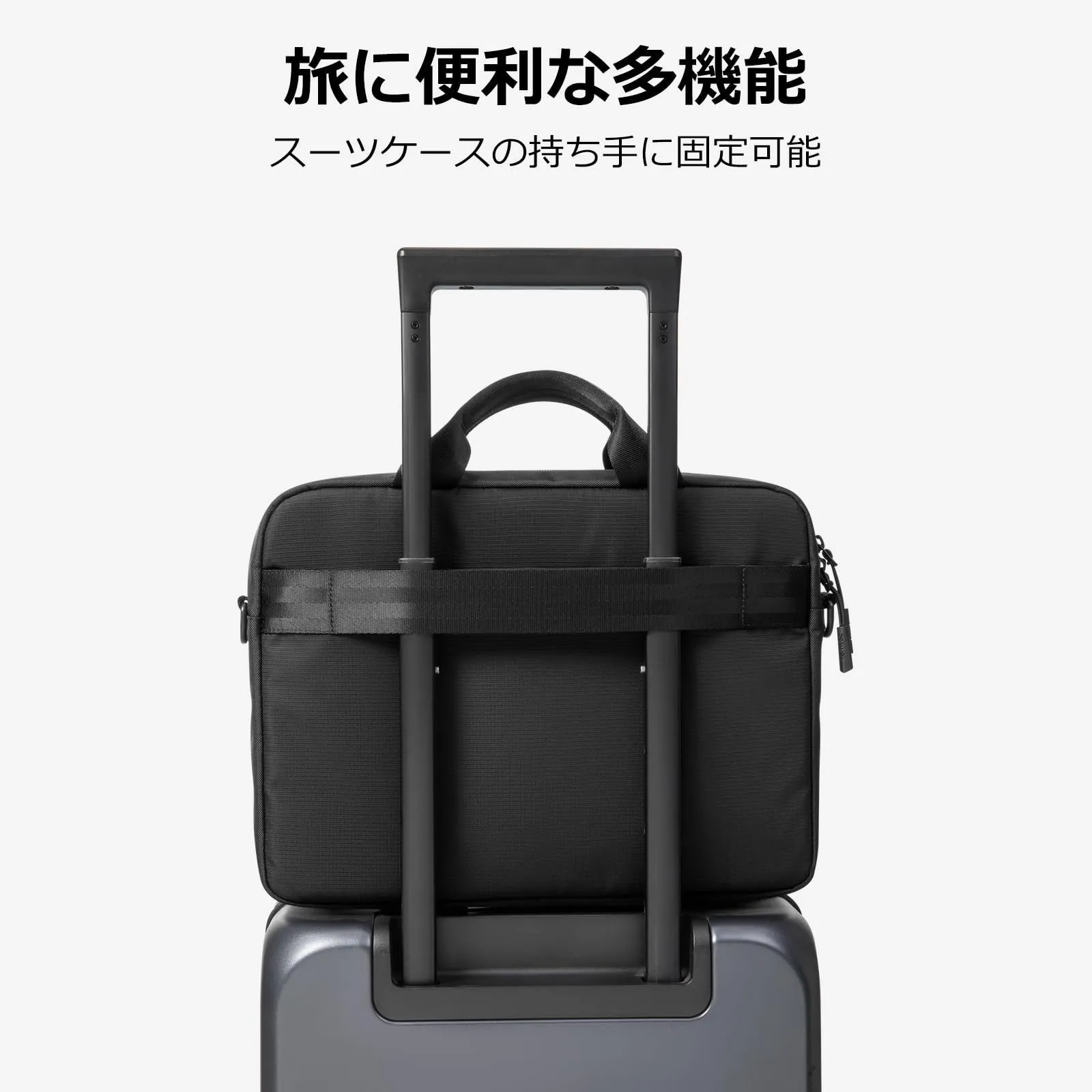 【洗練されたビジネスデザイン】黒を基調としたシンプルなデザインで、スーツにもオフィスカジュアルにも自然にマッチ。通勤や出張、商談など幅広いシーンで活躍します。手持ち・ショルダーの2WAY仕様で、スーツケースにも装着可能。