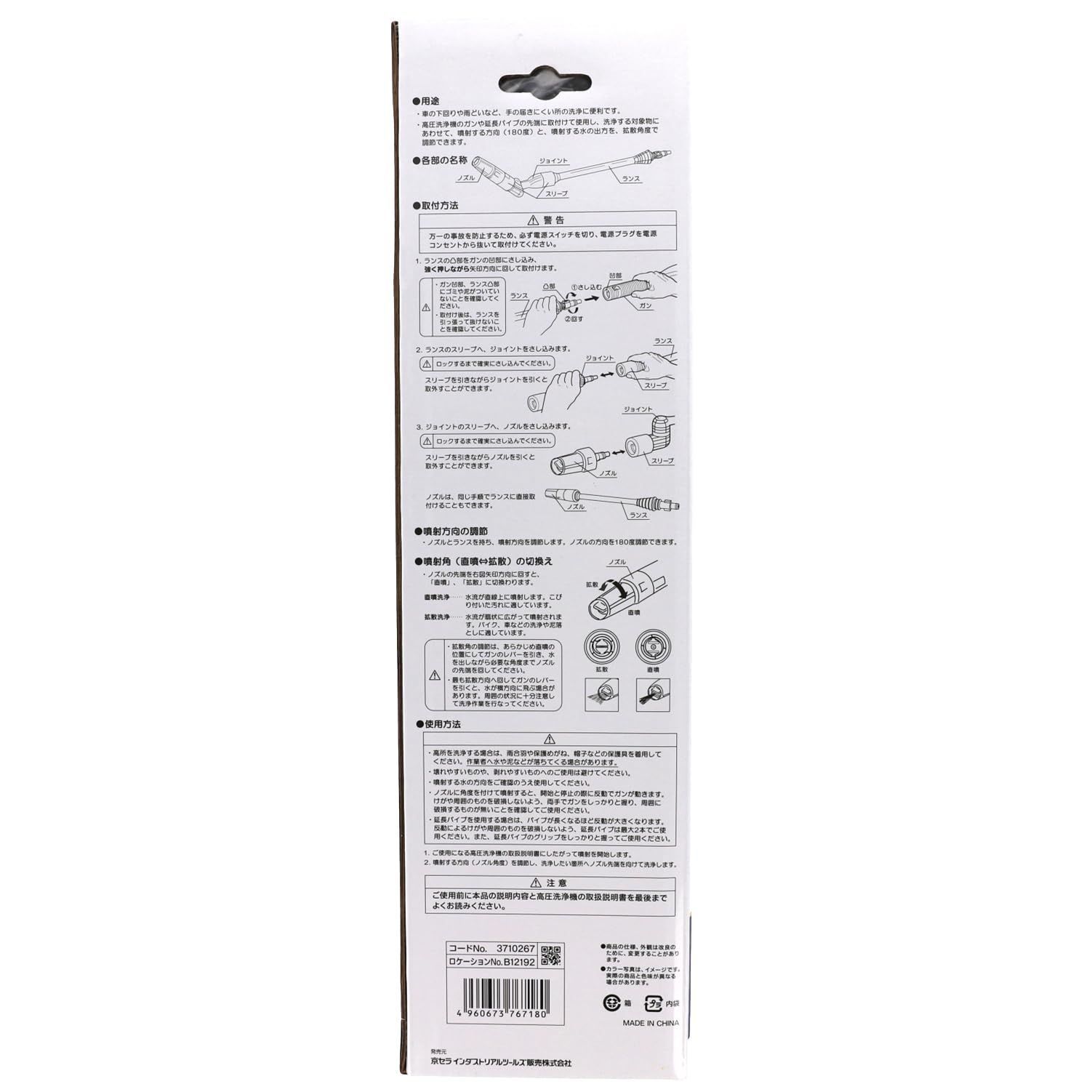 【特徴】 ・バリアブルノズル付のため汚れの範囲や状態に合わせて直噴と拡散の調整が可能 ・ノズルとジョイント、ジョイントとランスの接続がワンタッチで簡単に行える ・ガンに直接取り付けて使用が可能 ・車や農機具のアンダーボディやタイヤハウス等の洗浄、家周りの屋根、塀の上面の清掃に便利