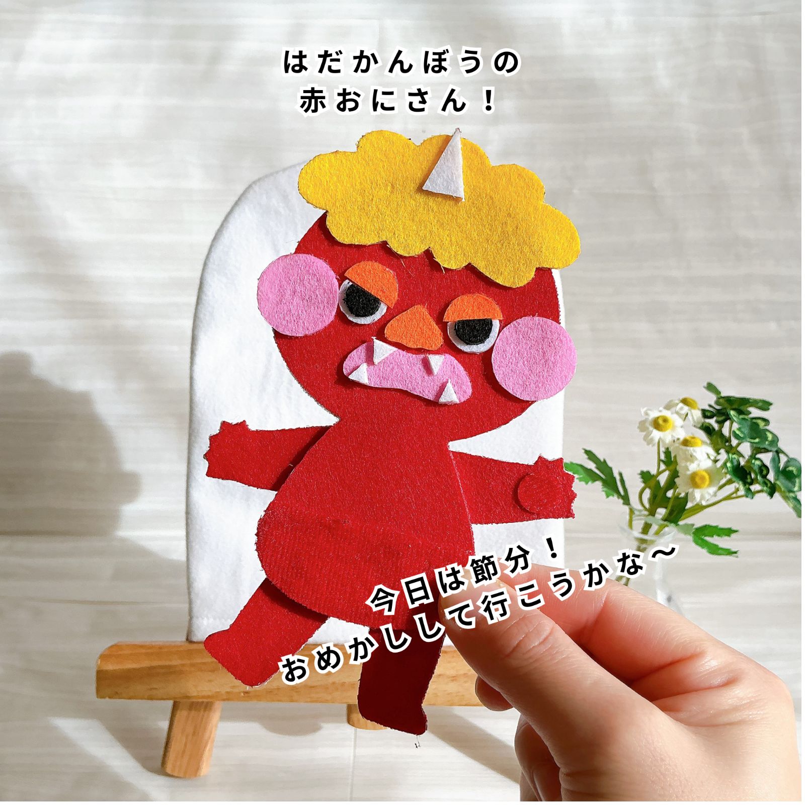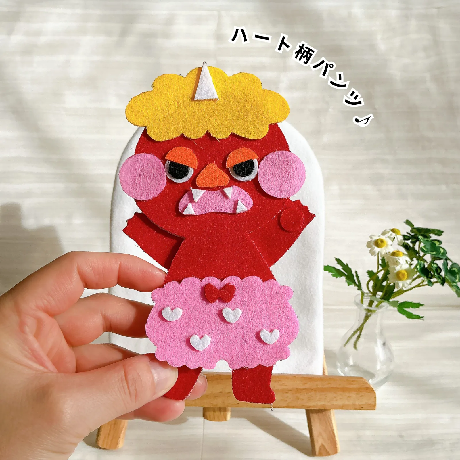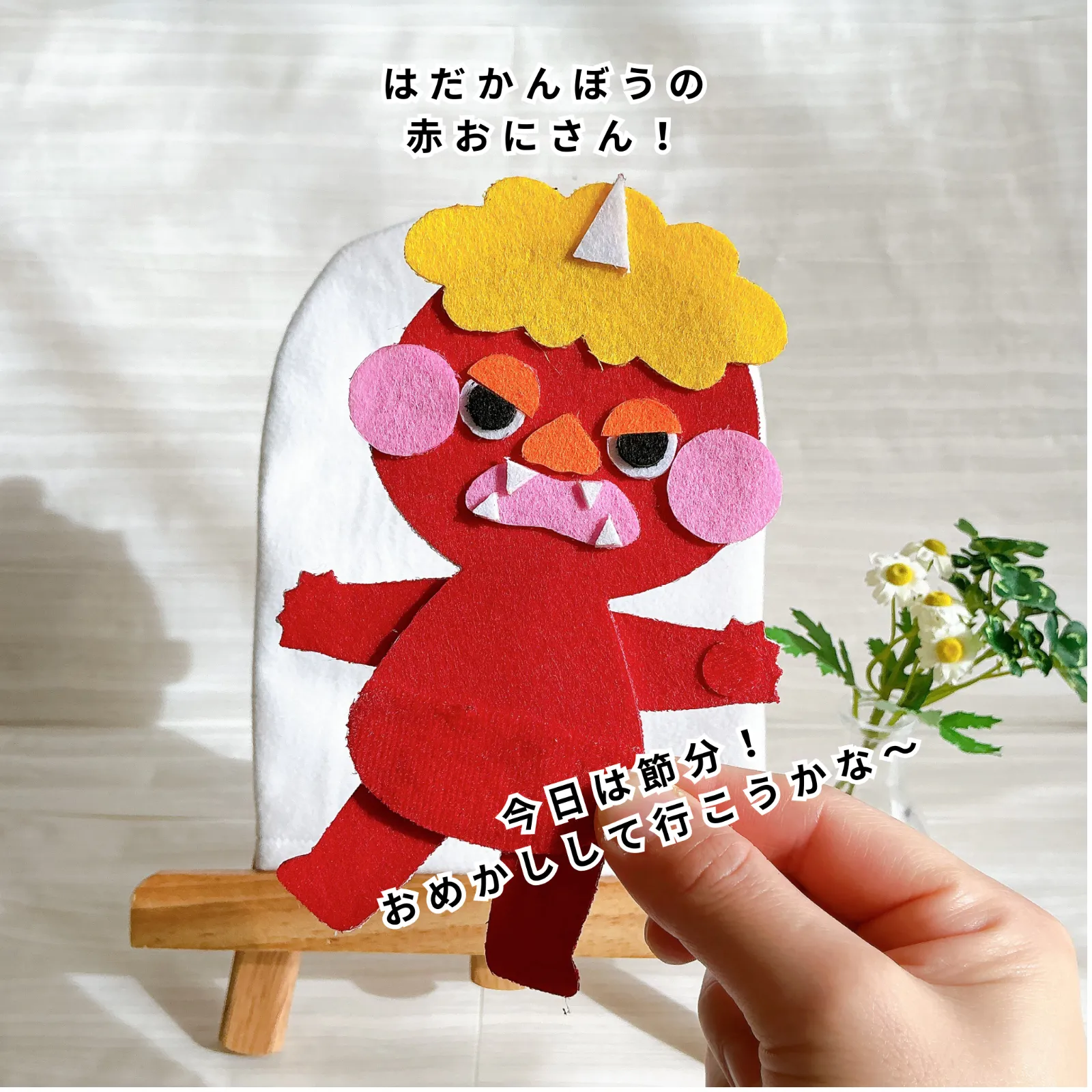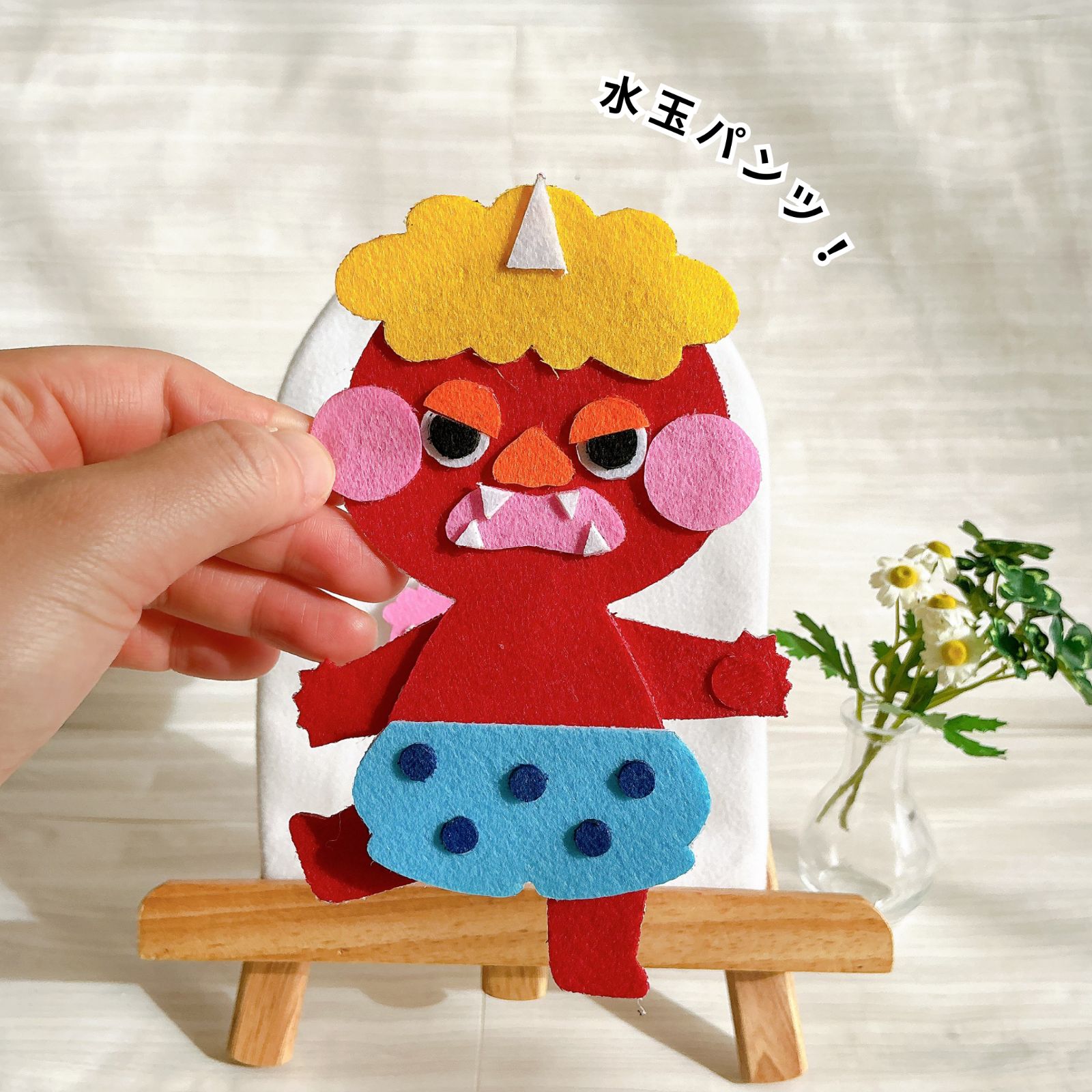 【シアターの特徴】 ◯『おにのパンツ』『まめまき』の歌詞付きです! ◯手袋は両面トイクロス生地です。 ◯人形はトイクロスに貼ったり外したりと自由に動かせます。 ◯鬼の腰と左手にもトイクロスが付いているのでパンツを着替えたり、金棒を持ったり出来ます! ◯鬼の手足は自由に動かせます! ◯硬めのフェルトを2枚重ねにして比較的丈夫にできています。