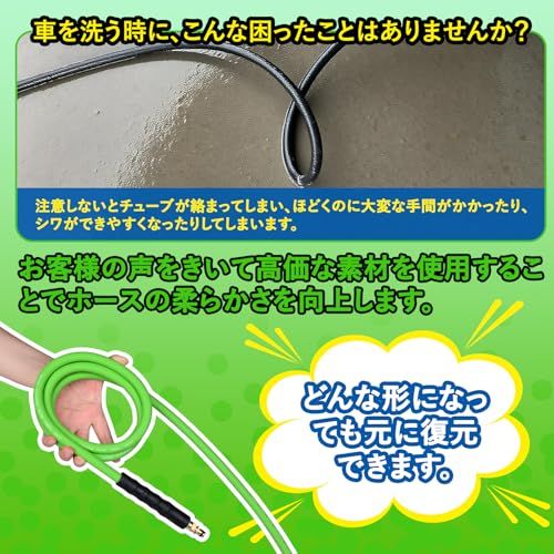 【ケルヒャーホースの巻き癖のトラブルを軽減】 ご存知のように洗車作業中、愛車の違う部分にさまざまな方向に狙って洗車します。 そのため、頻繁にホースの向きを変える必要がある。 チューブの重さや硬さのため方向転換が難しい場合はあります。 本製品はケルヒャー高圧洗浄機向けに設計するものです。100%ステンレス製コネクターを採用してケルヒャーがんとホースを連続できます。洗浄作業中にホースをひねる必要はなく、ガンとコネクターの間のリンクを軽く回るだけで角度が変わります。 注:梱包時にホースが曲がっているため、洗車前に予めホースをまっすぐにし、整理しておくと作業がしやすくなります。