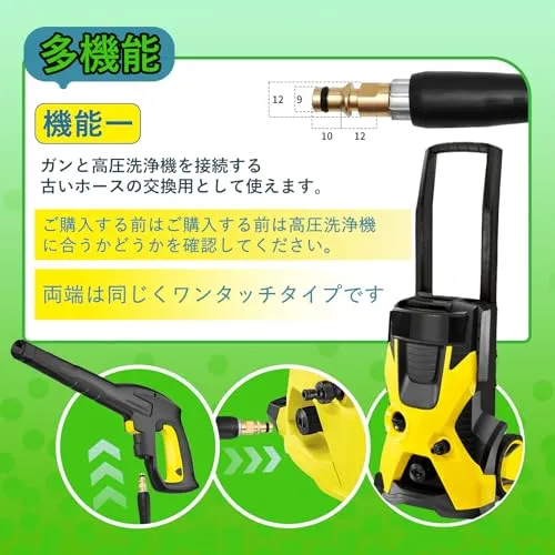 【接続機能や延長機能あります】本商品の両端がクイックコネクターです。 ご購入前に前のホースはクイックタイプかどうかをご確認ください。両端クイックタイプで高圧洗浄機からケルヒャーどりがガンやケルヒャーショートガンまでの接続が可能です。 接続器を利用して2つのクイックタイプホースは延長可能で本体を移動することなく、庭などより広い場所を掃除するのは楽になります。