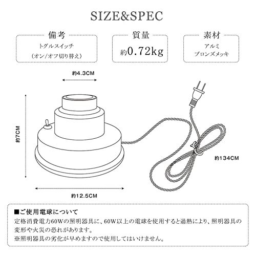 スペック:直径(Φ)約12.5cm高さ(H)約7cm コード長さ:約130-150cm 重量:720g 付属品:取扱説明書 備考:トグルスイッチ(オン/オフ切り替え)(調光不可) 素材:アルミ カラー:ブロンズメッキ 消費電力:MAX.60W 電源方式:AC 100V 対応電球:口金E26(別売り) ※定格消費電力60Wの照明器具に、60W以上の電球を使用すると過熱により、照明器具の変形や火災の恐れがあります。※照明器具の劣化が早めますので使用してはいけません。