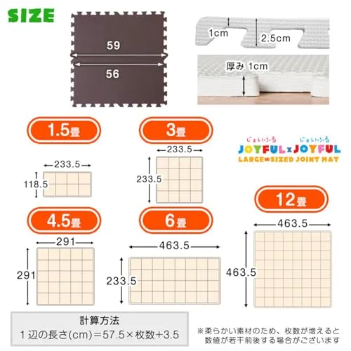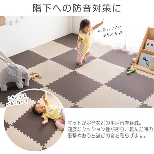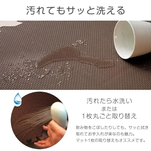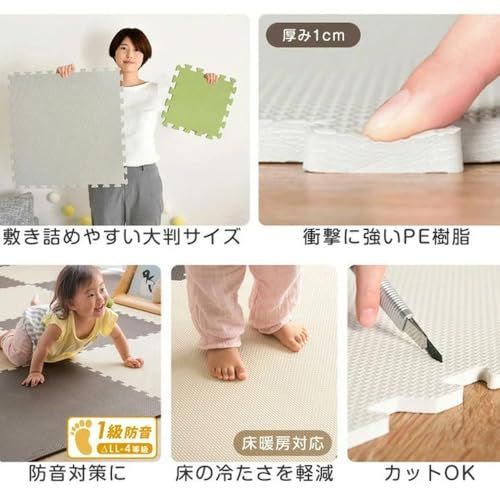 【お手入れ方法】・生産上マットをカットする際に生じた粉末が付着している場合がございます。 一度綺麗に水拭きしてからご使用ください。色落ちではありませんので、ご安心ください。 ・汚れた場合は固く絞った雑巾で拭き取るか、水洗いをしてください。 ・水分が隙間に入り込んだ場合はカビ発生の原因となる場合がありますので、定期的にマットを剥がして掃除してください。 ・匂いが気になる場合は、風通しの良いところで陰干してください。 ・表面の凹凸の深さに若干の個体差がある場合がございます。 ・ロットによって色味が異なる場合がございます。 ・床暖房の種類等によって、商品に多少の反りが生じる場合がございます。 ・PE素材の特性上、使用するうちに負荷がかかる部分に多少のへたりが生じます。 そのため、既に使用しているマットに新しいマットを繋げて使用する際、上手く繋がらない場合もございますので、予めご了承ください。 2019年1月10日に素材をEVAからPEに変更しました ※床材(塩化ビニル・フローリング等)によって、色移りや変色が起こる場合がございます。床とマットの間に敷物や防護シートを敷いていただくことを推奨しております。