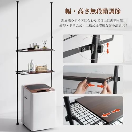 【横幅&高さを自由に調整!洗濯機周りに完璧フィット】一般的なランドリーラックは高さのみ調整可能に対して、当製品は高さに加えて横幅の伸縮も対応!洗濯機のサイズや設置場所に合わせてぴったり調整できる。大型洗濯機からコンパクトタイプまで、縦型・ドラム式・二槽式洗濯機など、無駄なくスペースを活用できる。
