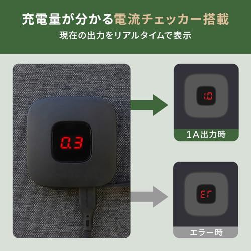 充電量の目安になる電流チェッカー搭載:コントロールボックスから充電する機器に流れる電流が表示され、太陽光が当たって電流が流れているかを確認することができます。 ※電流値は目安です。精密な計測や記録を目的とした機能ではありません。