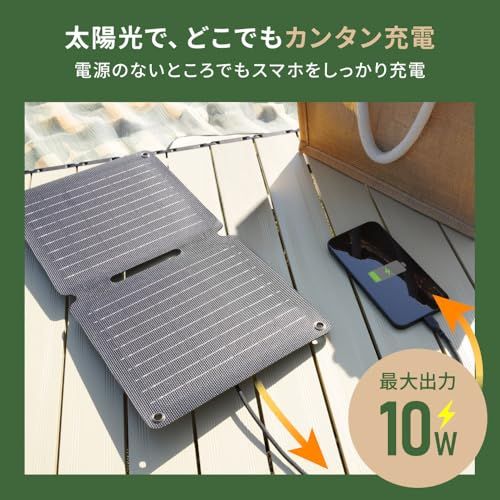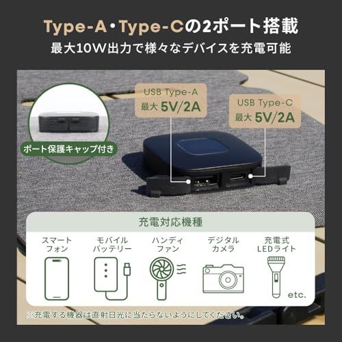 高効率な単結晶シリコンパネル:電力ロスの少ない単結晶シリコンパネルを2面搭載。最大変換効率は22.4%、発電性能は最大10W。小型ながらしっかり発電し、安定した充電をサポートします。 ※発電量は設置場所、天候条件、日照時間によって変動します。