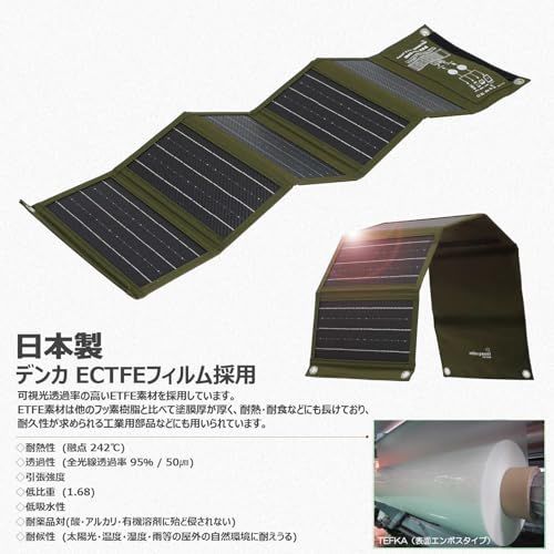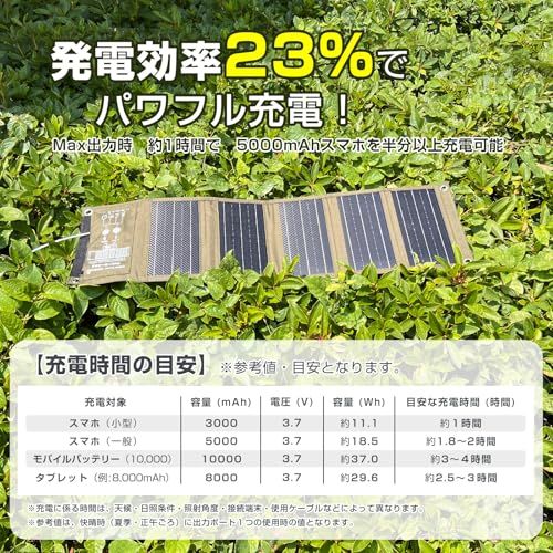 【仕様】出力(USB/DC):18W(最大値)・ 短絡電流:6.70V5%・ 開回路電圧:3.20A5%・ 発電効率:23%・ 出力規格:USB-A出力1/TYPE-C出力1・ 出力端子:USB-A出力:5V/3.0A/ TYPE-C出力:5V/3.0A ※最大出力時の値は、太陽光の照射強度に左右されます。・ 材質:ソーラーパネル:ETFE加工単結晶ソーラーパネル/ 生地:ポリエステル60%・ 使用環境:温度:-2070/ 湿度:20%80%・ 重さ:約0.6(本体)・ 防水性能:※非防水・ サイズ:展開サイズ:816*220*20/ 折畳サイズ:220*130*40・ 化粧箱のサイズ:W240*H140*D56mm・ セット内容:ソーラーパネル、カラビナフック*2個、取扱説明書、保証書・ ※ガラス越しにソーラーパネルを充電しないでください。 ガラス越しでは光の質が低下し、パネルを電気に変換する効率に影響し、充電速度が低下します。 ※天候等により充電スピードが異なります。 ※各種端末側の仕様により、充電を開始できない場合がございます。