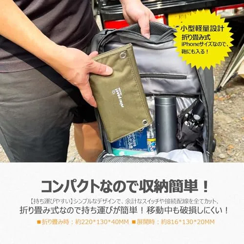 【財布サイズ】コンパクトながらパワフルなソーラーパネル 小型設計で、バッグやリュックに収納可能。アウトドアや緊急時の発電機として、ソーラーパネル 100Wクラスの実用性を実現しました。