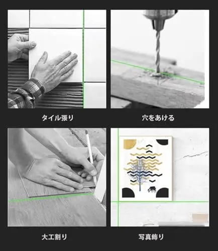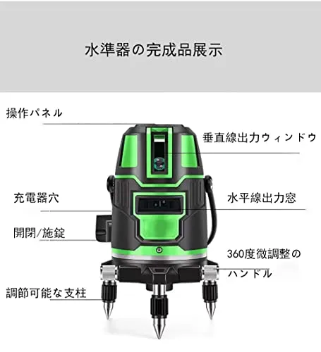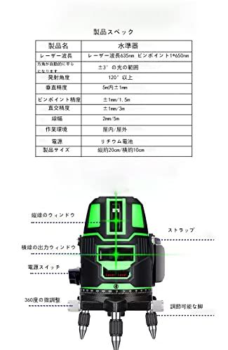 【高機能&高質感】高性能グリーンレーザーを採用することで、明るく見やすいライン照射が可能で、作業効率を向上させています。精密なライン調節ができるネジを採用しています。 360度は便利で、線の位置を調整することができて、2つの回転を組み合わせ、垂直線で正確に位置決め、誤差を減らし、仕事効率が大幅にアップできます。