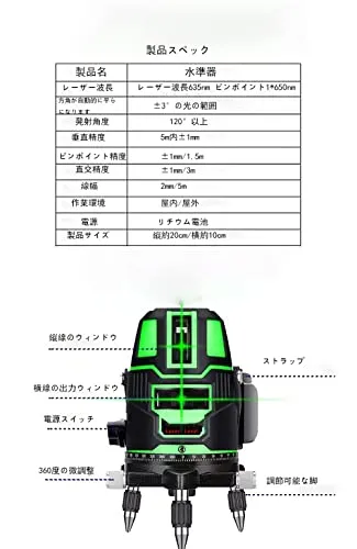 【製品仕様】光源:緑色可視半導体レーザー 520nm レーザー基準:クラス 2 水平精度: 1mm/5m 垂直精度: 1mm/5m 直角精度: 90 0.1 ライン幅: 1.5mm/5m 動作時間:約 4 時間 全照射時 仕事温度:? 10 50 防塵防水グレード: IP54 仕事場所:室内 室外