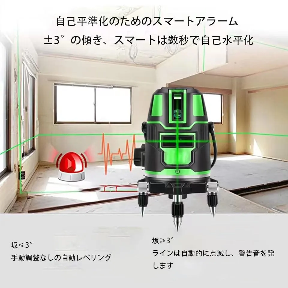 【自動調整機能】レーザー墨出し器の傾きを3以内に調整することができます。360度のレーザー墨出し器 エレベーター三脚シャーシを回転させて、線の位置は任意で調整することができます。誤差を減らし、仕事効率を向上させます。