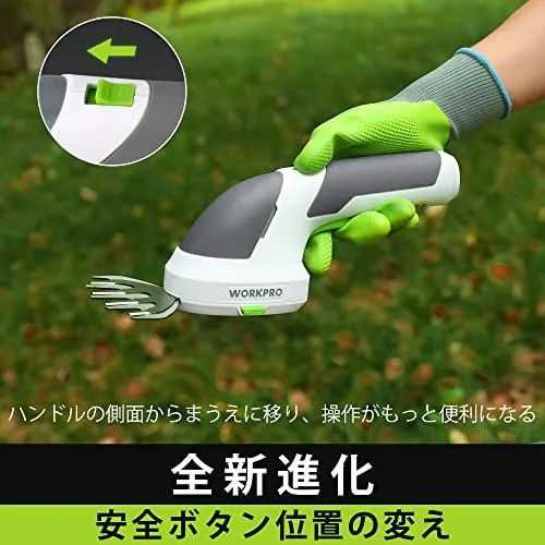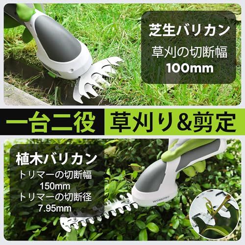 【送料無料】[安全ボタン進化]WORKPRO 芝生バリカン ガーデンバリカン 生垣バリカン 芝刈り機 一台二役 コードレス 7.2V充電式 二重安全ロック ブレード2枚付 バリカン刈幅100mm トリマー刈幅150mm 剪定 植木 園芸 W159034