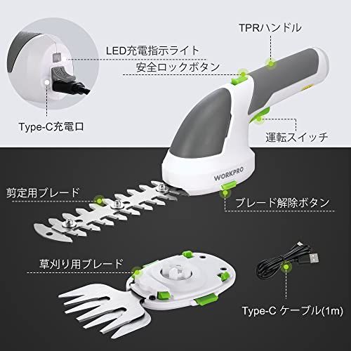 【商品仕様】バリカン刈込幅100mm、トリマー刈幅150mm、生垣バリカンの最大開口7.8mm。切断能力は切断対象の硬度と数量によって下がる場合もあります、ご了承ください。ストローク数:1100回/分。重さ:芝生バリカン0.37kg(ブレードを含めない)。usbケーブル付きます。