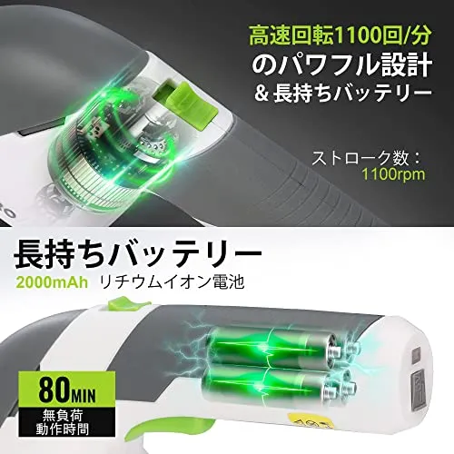 【効率向上7.2V充電式】7.2 V強力バッテリに全新進化、無負荷運転時間80分使用可能になります。コードレスタイプなので、コードが絡まったりひっかかる心配もなく、様々な場所で使用できます。USBケーブル(Type-C充電ポート)が付いて、ノートPC、車載充電などに対応充電できます。それに、普通の市販されているアタプター(5V/1A)にも接続して、充電ができるので便利です。フル充電の時間は約2-3時間です。充電が完了するとインジケーターライトが緑色に点灯します。ストローク数は一分1100回、剪定の効率が向上になります。ご注意:USBケーブルに接続する市販されている出力5V/2Aアタプターをご利用してくださいませ、(アダプター出力5V/1A)足りない場合、充電ができなくなります。出力電圧が過電圧保護動作値(アダプター出力5V/1A)を超えた際に、過電圧保護回路が動作し、出力を停止させ、充電ができなくなります。