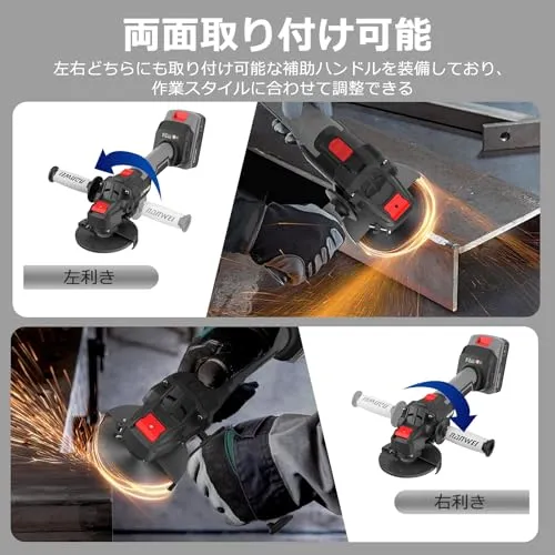 【補助ハンドルと運転スイッチロック】左右どちらにも取り付け可能な補助ハンドルを装備しており、作業スタイルに合わせて調整が可能です。運転スイッチロックは、スイッチを押したまま上にスライドさせ、下に押し込むことでロックされます。ロック後はスイッチを押さずに作業を継続できるため、グラインダー充電式は長時間の作業も楽に行えます。