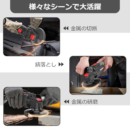 【多用途】当社充電式ディスクグラインダーは金属・木材の研磨、金属の切断、サビ落とし、塗装?がれ、曲面研磨など多彩なシーンに使えます。コードレスの設計で、場所を選ばず、自由自在に作業できます。