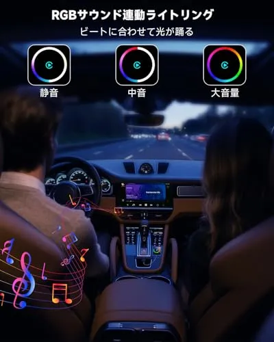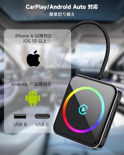 【送料無料】【正規品】carplay ワイヤレス 2026新型カープレイ CarPlayとAndroid Autoの2in1対応瞬時に自動接続 低遅延 USB-A/Cプラグアンドプレイ/RGBサウンド連動ライトリング/カレンダー/音楽/地図/Siri/通話(A