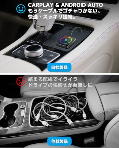 【ワイヤレスへのスムーズな移行】: 有線CarPlayからワイヤレス環境へ、簡単にアップグレード可能。 エンジンをかけるだけでアダプターが自動ペアリングし、追加アプリや面倒な設定は一切不要です。 配線のないスッキリとした車内で、快適なドライブ体験を実現します。