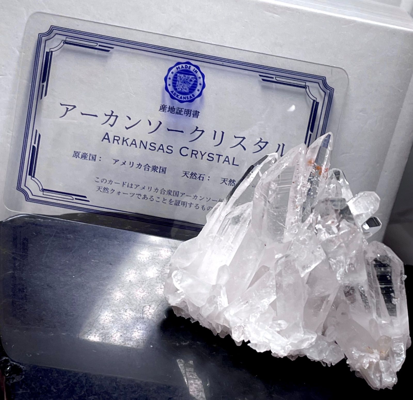 【アメリカ・アーカンソー州産】 <ギャランティカード付き> 幅約6㎝×横約4㎝×高さ約5㎝ 重量約68.5g 世界三大水晶の鉱山のひとつともいわれている「アーカンソー州産」透明水晶クラスターです☆ 透明感とシャープなエッジが特徴のアーカンソー水晶クラスターは宝石のような美しさと神聖な輝きを放ちます☆形も美しく、虹(アイリス)も見え、大変おすすめのクラスターです^ ^